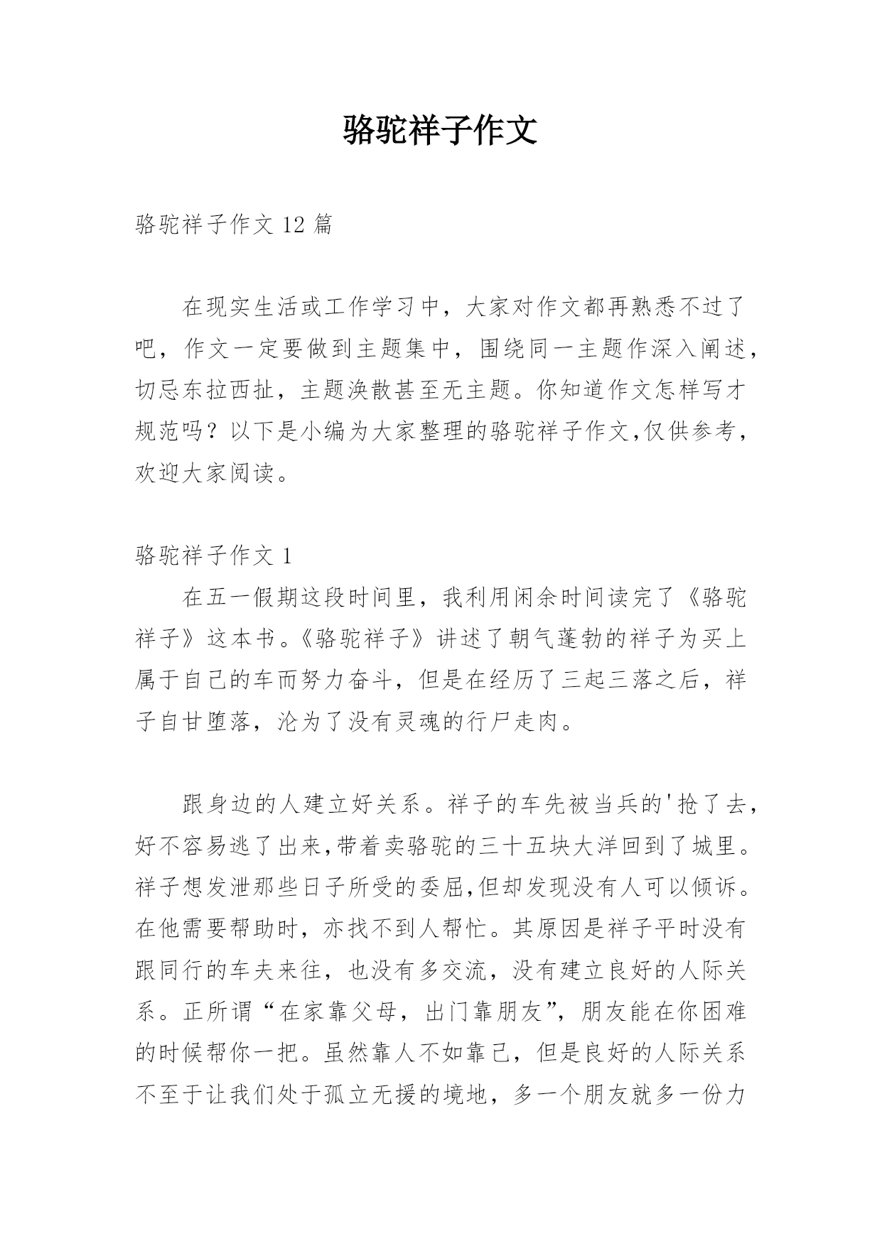 骆驼祥子作文骆驼祥子作文12篇在现实生活或工作学习中,大家对作文都再熟悉不过了吧,作文一定要做到主题集中,围绕同一主题作深入阐述,切忌东拉西扯,主题涣散甚至无主题。你知道作文怎样写才规范吗?以下是小编为大家整理的骆驼祥子作文,仅供参考,欢迎大家阅读。骆驼祥子作文1在五一假期这段时间里,我利用闲余时间读完了《骆驼祥子》这本书。《骆驼祥子》讲述了朝气蓬勃的祥子为买上属于自己的车而努力奋斗,但是在经历了三起三落之后,祥子自甘堕落,沦为了没有灵魂的行尸走肉。跟身边的人建立好关系。祥子的车先被当兵的'抢了去,好不容