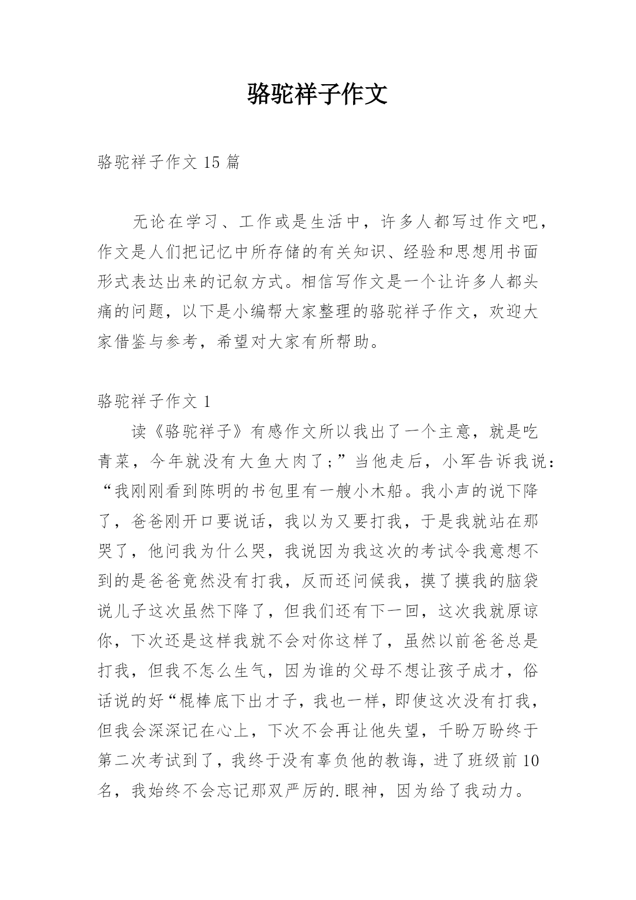 骆驼祥子作文骆驼祥子作文15篇无论在学习、工作或是生活中,许多人都写过作文吧,作文是人们把记忆中所存储的有关知识、经验和思想用书面形式表达出来的记叙方式。相信写作文是一个让许多人都头痛的问题,以下是小编帮大家整理的骆驼祥子作文,欢迎大家借鉴与参考,希望对大家有所帮助。骆驼祥子作文1读《骆驼祥子》有感作文所以我出了一个主意,就是吃青菜,今年就没有大鱼大肉了;”当他走后,小军告诉我说:“我刚刚看到陈明的书包里有一艘小木船。我小声的说下降了,爸爸刚开口要说话,我以为又要打我,于是我就站在那哭了,他问我为什么哭,