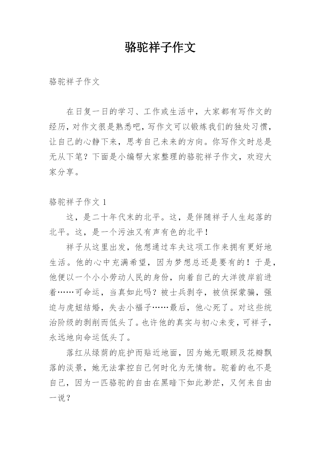 骆驼祥子作文骆驼祥子作文在日复一日的学习、工作或生活中,大家都有写作文的经历,对作文很是熟悉吧,写作文可以锻炼我们的独处习惯,让自己的心静下来,思考自己未来的方向。你写作文时总是无从下笔?下面是小编帮大家整理的骆驼祥子作文,欢迎大家分享。骆驼祥子作文1这,是二十年代末的北平。这,是伴随祥子人生起落的北平。这,是一个污浊又有声有色的北平!祥子从这里出发,他想通过车夫这项工作来拥有更好地生活。他的心中充满希望,因为梦想总还是要有的!于是,他便以一个小小劳动人民的身份,向着自己的大洋彼岸前进着……可命运,当真如