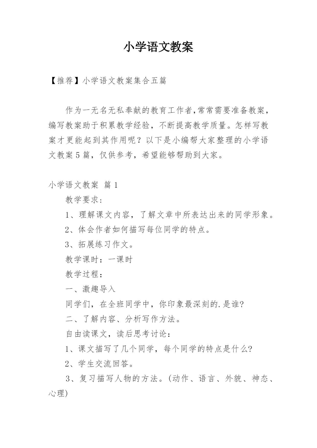 小学语文教案【推荐】小学语文教案集合五篇作为一无名无私奉献的教育工作者,常常需要准备教案,编写教案助于积累教学经验,不断提高教学质量。怎样写教案才更能起到其作用呢?以下是小编帮大家整理的小学语文教案5篇,仅供参考,希望能够帮助到大家。小学语文教案篇1教学要求:1、理解课文内容,了解文章中所表达出来的同学形象。2、体会作者如何描写每位同学的特点。3、拓展练习作文。教学课时:一课时教学过程:一、激趣导入同学们,在全班同学中,你印象最深刻的.是谁?二、了解内容、分析写作方法。自由读课文,读后思考讨论:1、课文描