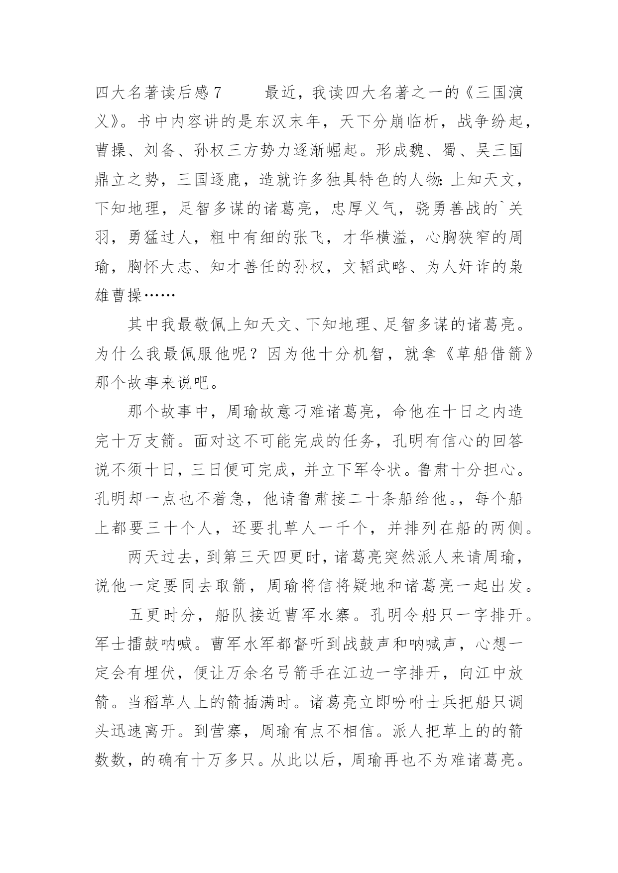 四大名著的读后感四大名著的读后感集合2篇当品读完一部作品后,相信大家的视野一定开拓了不少,为此需要认真地写一写读后感了。那么我们该怎么去写读后感呢?以下是小编精心整理的四大名著的读后感,欢迎阅读与收藏。四大名著的读后感1《三国演义》是我百读不厌的一本书《三国演义》是我百读不厌的一本书,不一样的时期读它,有着不一样的感受。在幼儿园时,看的是连环画《三国演义》,它在我心中是一个个传奇的故事,桃园三结义,三顾茅庐,赤壁之战……。我还明白了俗语“三个臭皮匠,赛过诸葛亮”,“周瑜打黄盖,一个愿打,一个愿挨。”、“肚