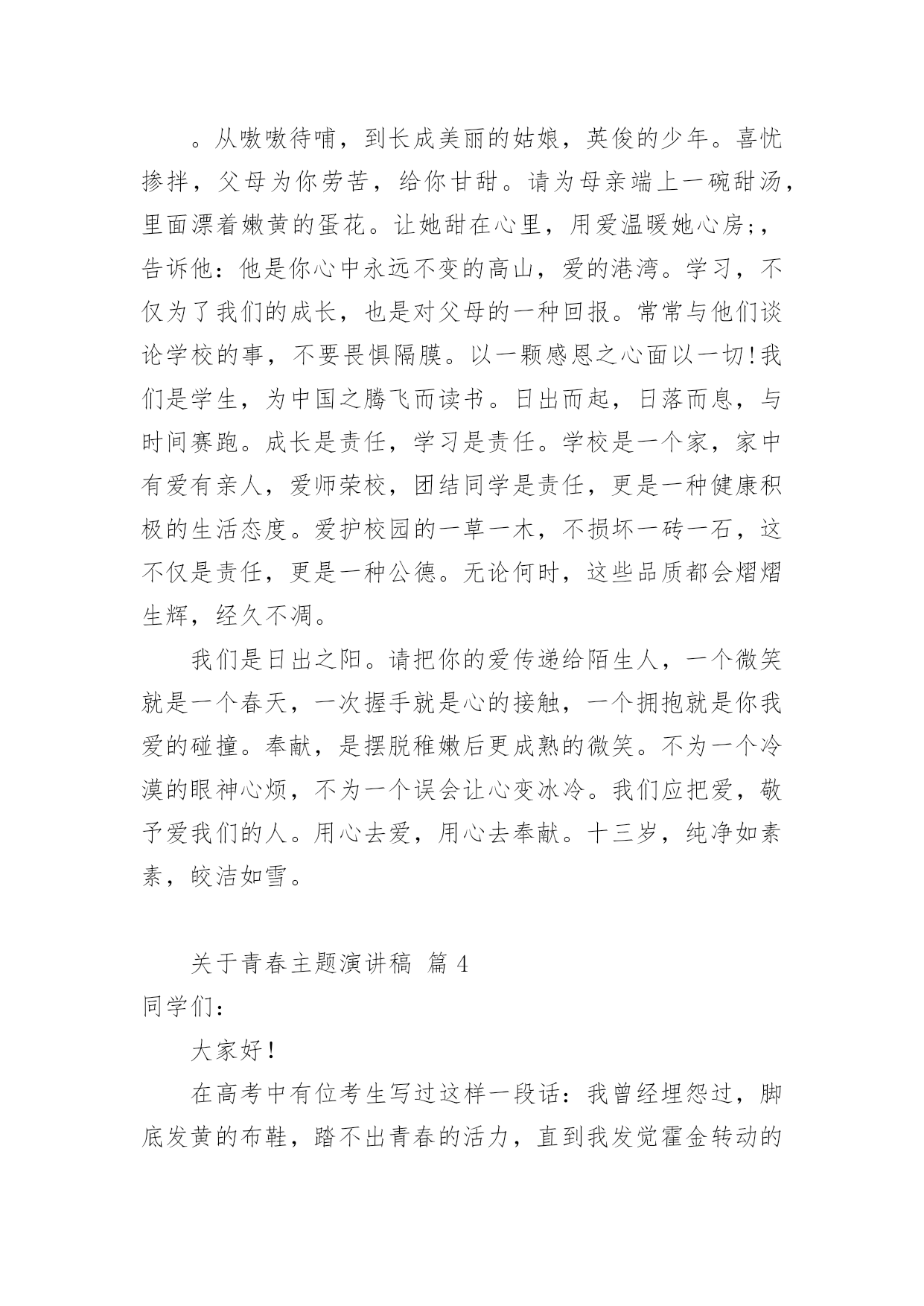 青春主题演讲稿演讲稿的格式由称谓、开场白、主干、结尾等几部分组成。在日新月异的现代社会中,演讲稿与我们的生活息息相关,演讲稿的注意事项有许多,你确定会写吗?下面是小编帮大家整理的关于青春主题演讲稿,供大家参考借鉴,希望可以帮助到有需要的朋友。关于青春主题演讲稿1尊敬的各位老师,同学,你们好:青春是迷人的,许多人在青春光华里谱写了辉煌灿烂的人生,宋朝21岁的辛弃疾以“金戈铁马,气吞万里如虎”的气势领兵抗金;周总理19岁时便写了气壮山河的“大江歌罢掉头东”,以表达把青春献给祖国解放事业的决心;雷锋同志19岁参
