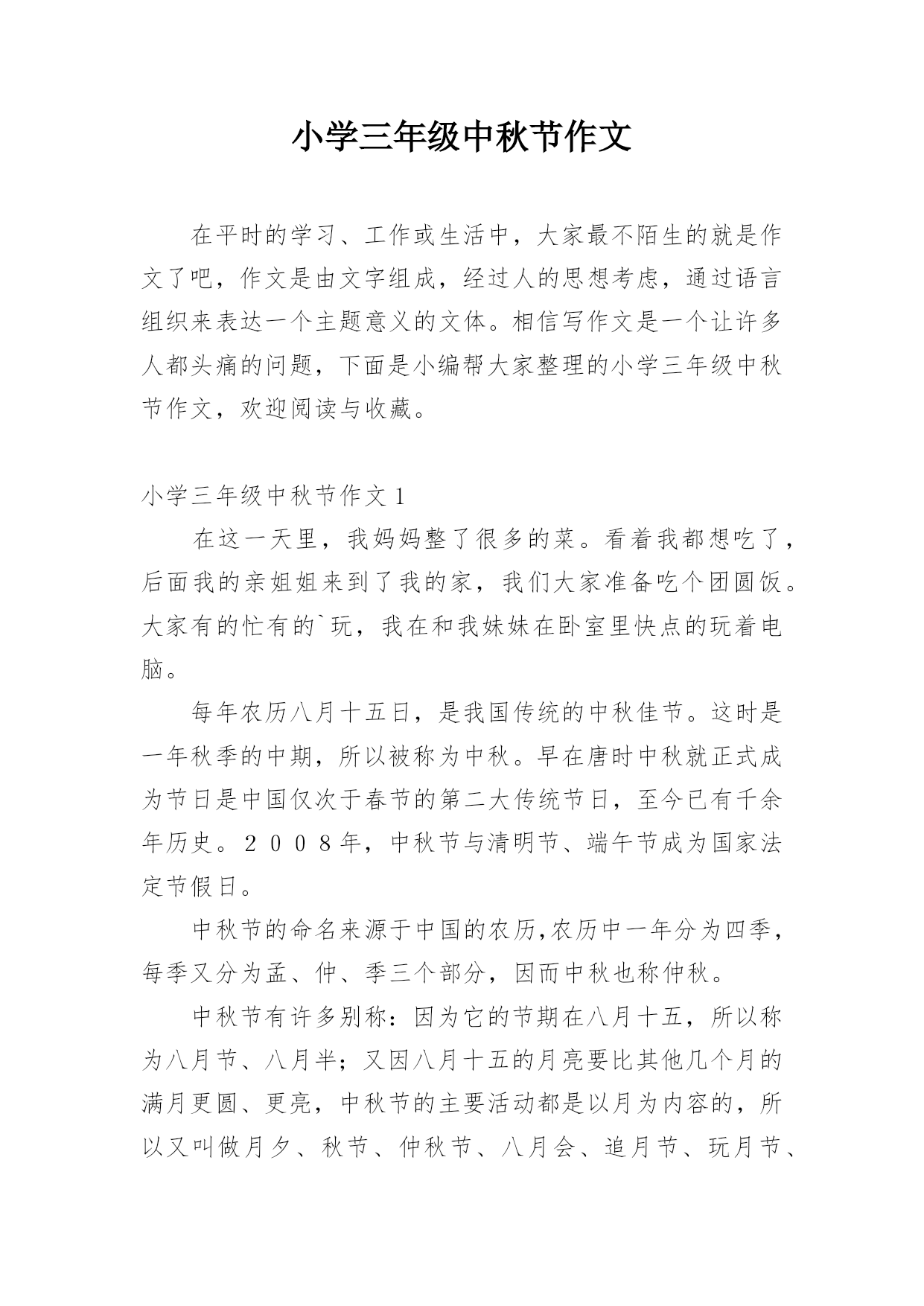 小学三年级中秋节作文在平时的学习、工作或生活中,大家最不陌生的就是作文了吧,作文是由文字组成,经过人的思想考虑,通过语言组织来表达一个主题意义的文体。相信写作文是一个让许多人都头痛的问题,下面是小编帮大家整理的小学三年级中秋节作文,欢迎阅读与收藏。小学三年级中秋节作文1在这一天里,我妈妈整了很多的菜。看着我都想吃了,后面我的亲姐姐来到了我的家,我们大家准备吃个团圆饭。大家有的忙有的`玩,我在和我妹妹在卧室里快点的玩着电脑。每年农历八月十五日,是我国传统的中秋佳节。这时是一年秋季的中期,所以被称为中秋。早在