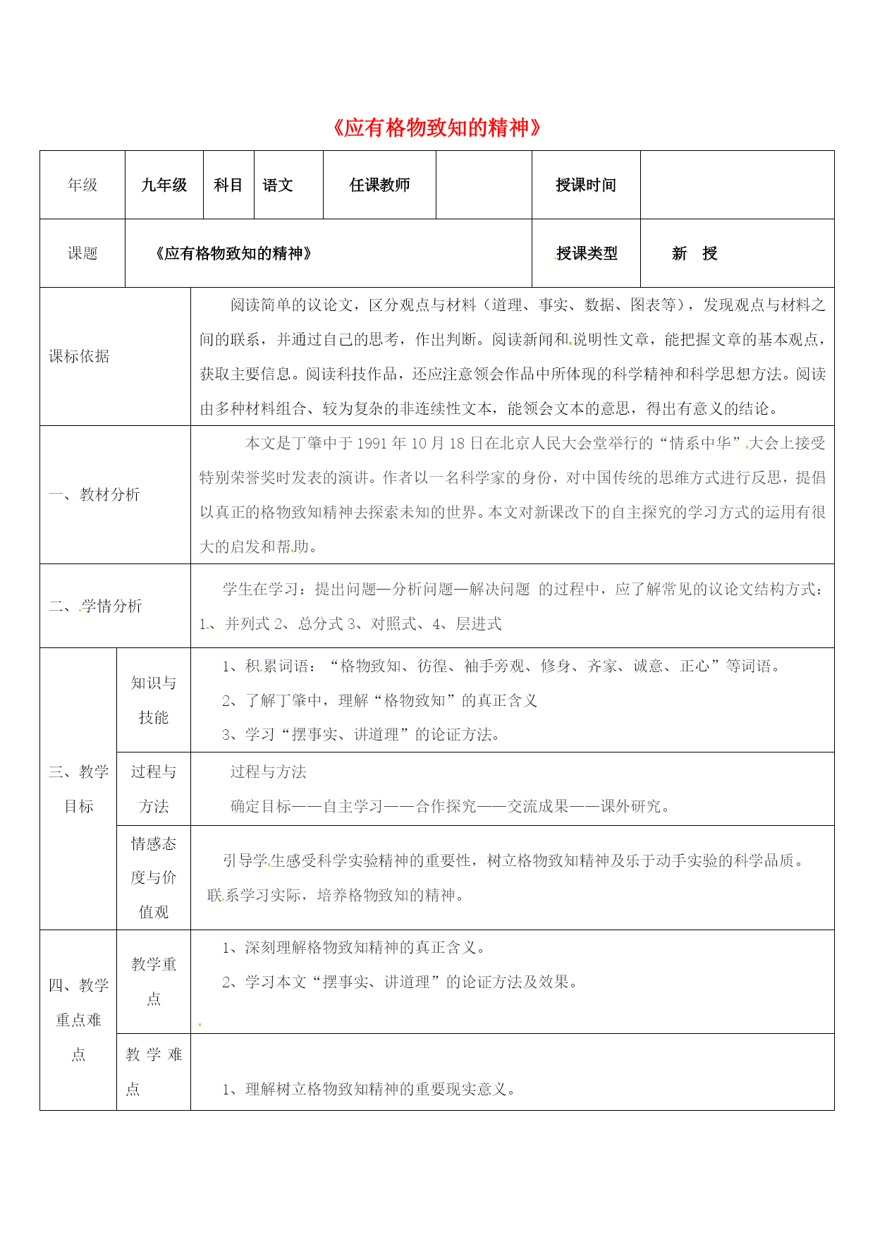 应有格物致知精神教学目标:1.理解真正的格物致知的精神。2.理解文章的论证方法。3.学习编写阅读提纲。重点难点:(l)理解真正的格物致知的精神。(2)学习编写阅读提纲。(3)理解文章的论证方法。教学时间:一课时教学过程一、导入1.作者简介。2导语。有人说中国的孩子“高分低能”“会读书不会研究”缺乏创新精神和实践动手能力。问题出在哪里呢?丁肇中教授的文章会给我们极大的启发。三、整体感知1.默读课文,讨论编写阅读提纲。讨论并归纳:可从提出问题、分析问题、解决问题这三个部分来列提纲。第一部分(l~2段):提出问