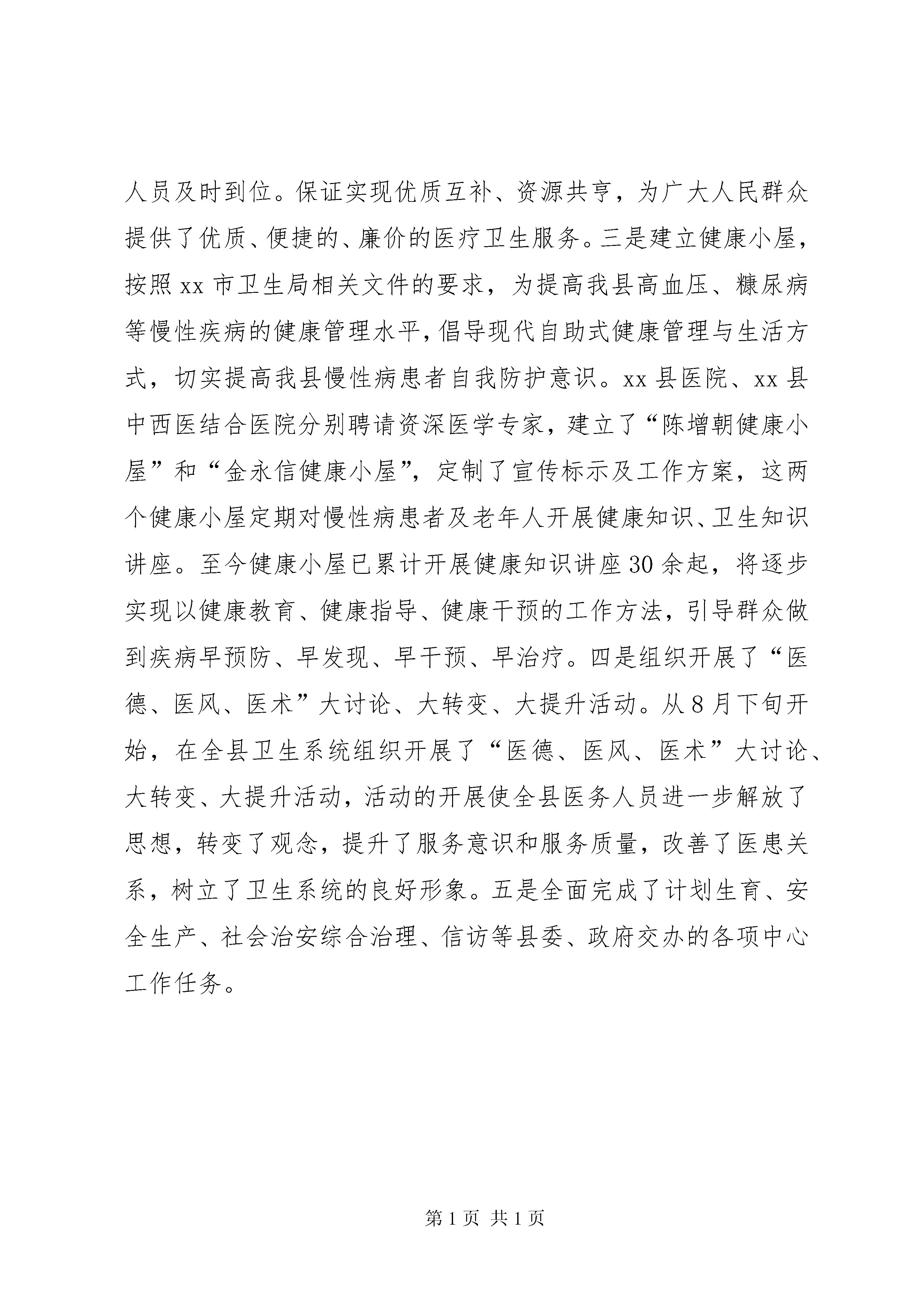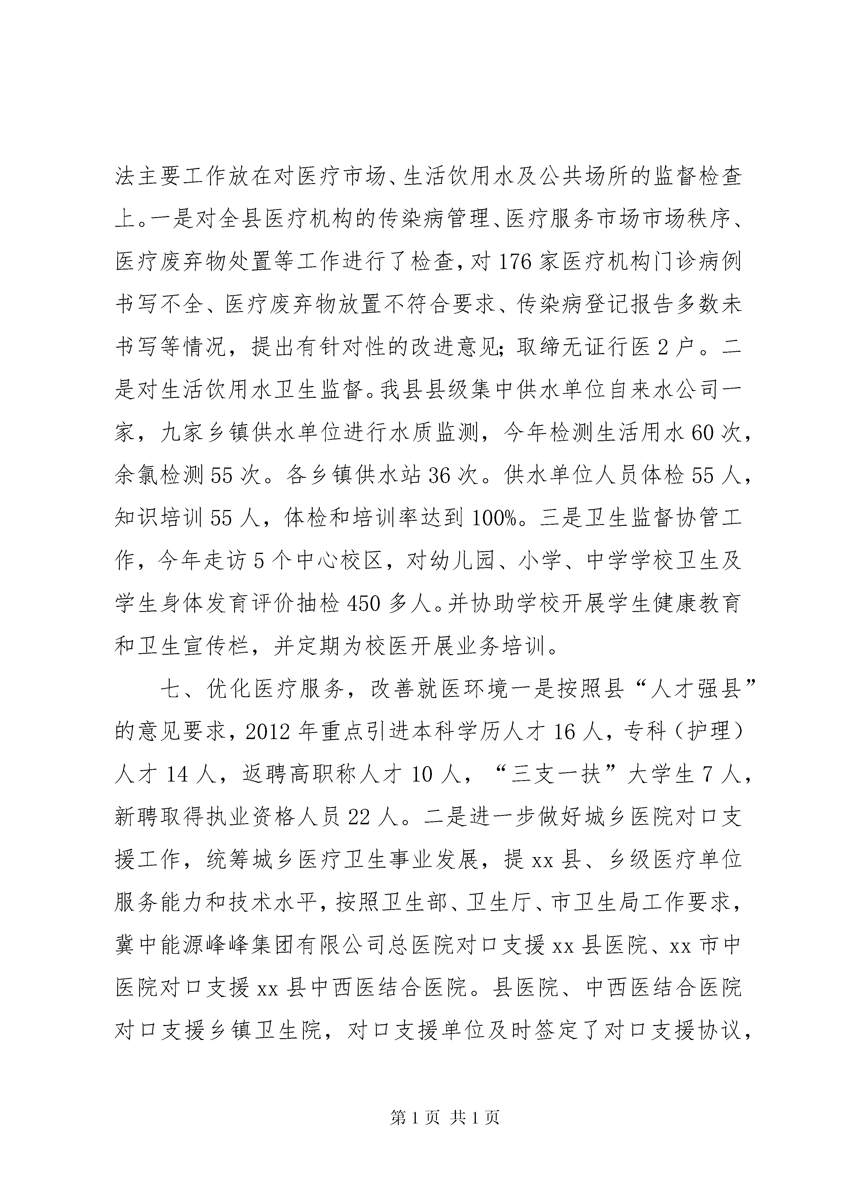 县卫生局工作报告一、圆满完成医改各项任务目标一是国家基本药物制度稳步实施。按照省、市有关文件精神,在7家乡镇卫生院和2家综合门诊部实行药品集中采购、统一配送和零差率销售的基础上,12月下旬,全县169个一体化管理村卫生室也全部实行了药品集中采购和零差率销售。为确保基本药物集中采购、统一配送、统一回款等相关工作有序开展,我们进一步完善了相关制度,并在县财政局设立了药品回款专户,定期、不定期对各基层医疗机构药品采购、仓储、使用等情况进行督导检查,发现问题及时解决。2012年我县共网上