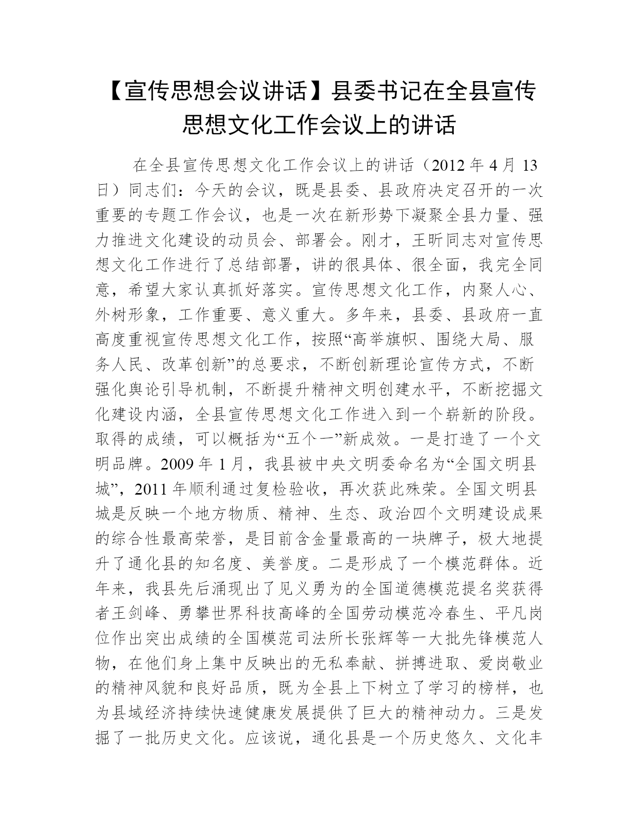 【宣传思想会议讲话】县委书记在全县宣传思想文化工作会议上的讲话在全县宣传思想文化工作会议上的讲话(2012年4月13日)同志们:今天的会议,既是县委、县政府决定召开的一次重要的专题工作会议,也是一次在新形势下凝聚全县力量、强力推进文化建设的动员会、部署会。刚才,王昕同志对宣传思想文化工作进行了总结部署,讲的很具体、很全面,我完全同意,希望大家认真抓好落实。宣传思想文化工作,内聚人心、外树形象,工作重要、意义重大。多年来,县委、县政府一直高度重视宣传思想文化工作,按照“高举旗帜、围绕大局、服务人民、改革创新