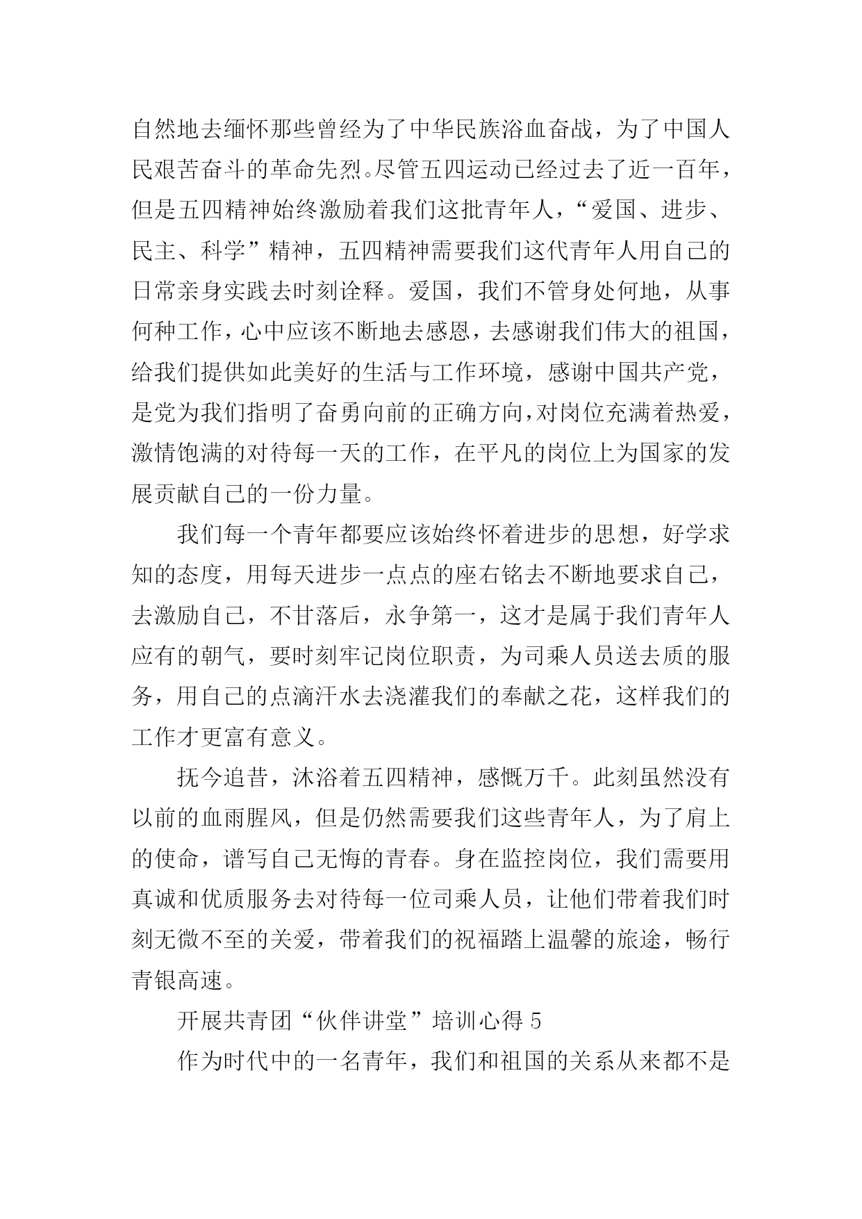 共青团伙伴讲堂培训心得共青团伙伴讲堂培训心得1又是一年一度的五四青年节的到来,说起五四青年节,大家的第一反应一定是想起那个曾经青少年们举行轰轰烈烈的爱国运动,称为五四运动。五四运动传达了我们作为青少年要积极创新、热爱祖国、积极探索科学的爱国主义精神,五四运动作为光辉的一页已经翻篇,而铭记历史是为了更好的创造未来,五四运动给人们带来了代代相传的五四精神,五四精神是我们每个青年都应该学习的,我们要学会追寻青春的脚步,同时五四精神让现代青年们更加清楚的知道什么是爱国,要怎么爱国,如何让国家发展创新。作为青少年时