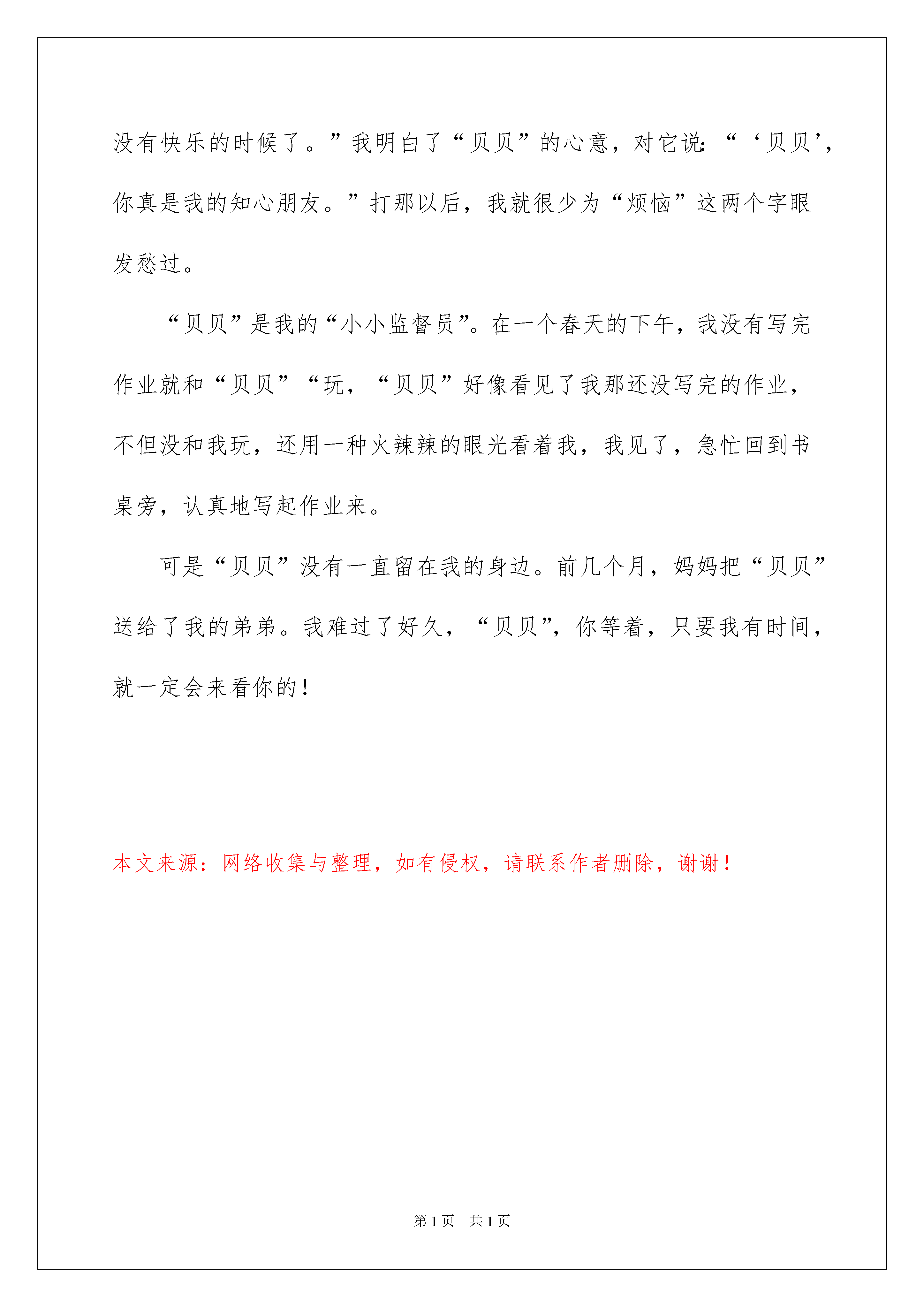 第页共NUMPAGES6页关于乌龟的三年级作文合集10篇乌龟的三年级作文篇1在一个月色朦胧的夜晚,森林里静悄悄的,一只小鹿欢快的在树林里跑来跑去,忽然,它听见了“呜呜”的哭声,心想,这么晚了,是谁在哭呢?于是,小鹿顺着哭声找过去,原来是一只小乌龟。小鹿关心地问道:“小乌龟弟弟,这么晚了你怎么还不回家啊?”小乌龟一边哭一边说:“小鹿姐姐,我下午出来玩,天黑了,我找不到回家的路了,呜呜。”小鹿说:“别着急,你爬到我背上来,我送你回家吧。”小乌龟感激地说:“真的呀,小鹿姐姐,太谢谢你了。”