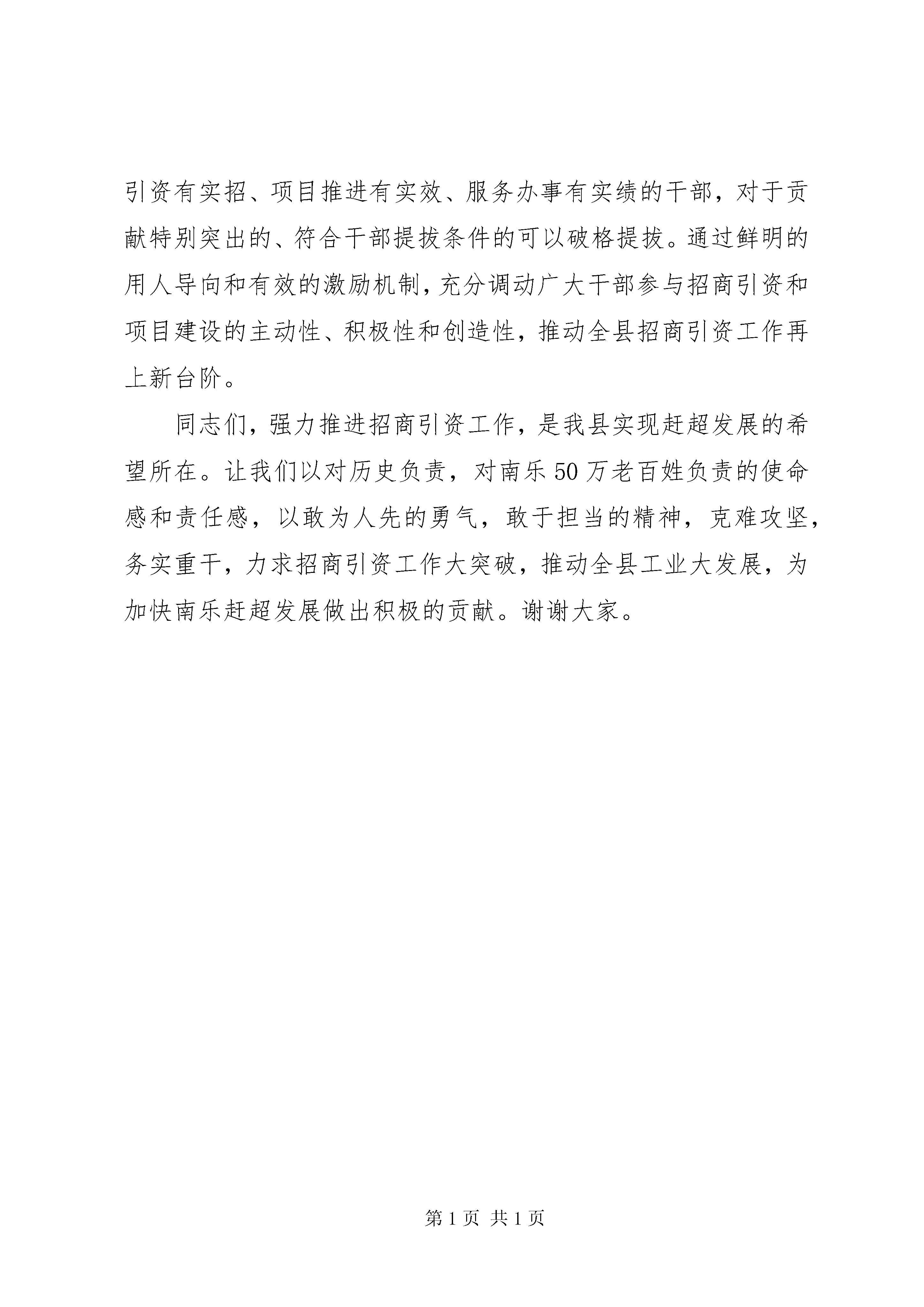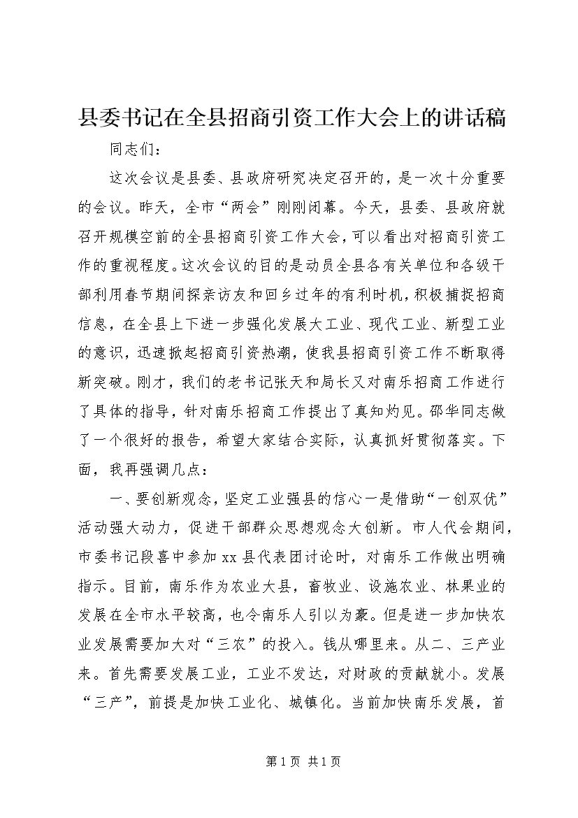 县委书记在全县招商引资工作大会上的讲话稿同志们:这次会议是县委、县政府研究决定召开的,是一次十分重要的会议。昨天,全市“两会”刚刚闭幕。今天,县委、县政府就召开规模空前的全县招商引资工作大会,可以看出对招商引资工作的重视程度。这次会议的目的是动员全县各有关单位和各级干部利用春节期间探亲访友和回乡过年的有利时机,积极捕捉招商信息,在全县上下进一步强化发展大工业、现代工业、新型工业的意识,迅速掀起招商引资热潮,使我县招商引资工作不断取得新突破。刚才,我们的老书记张天和局长又对南乐招商