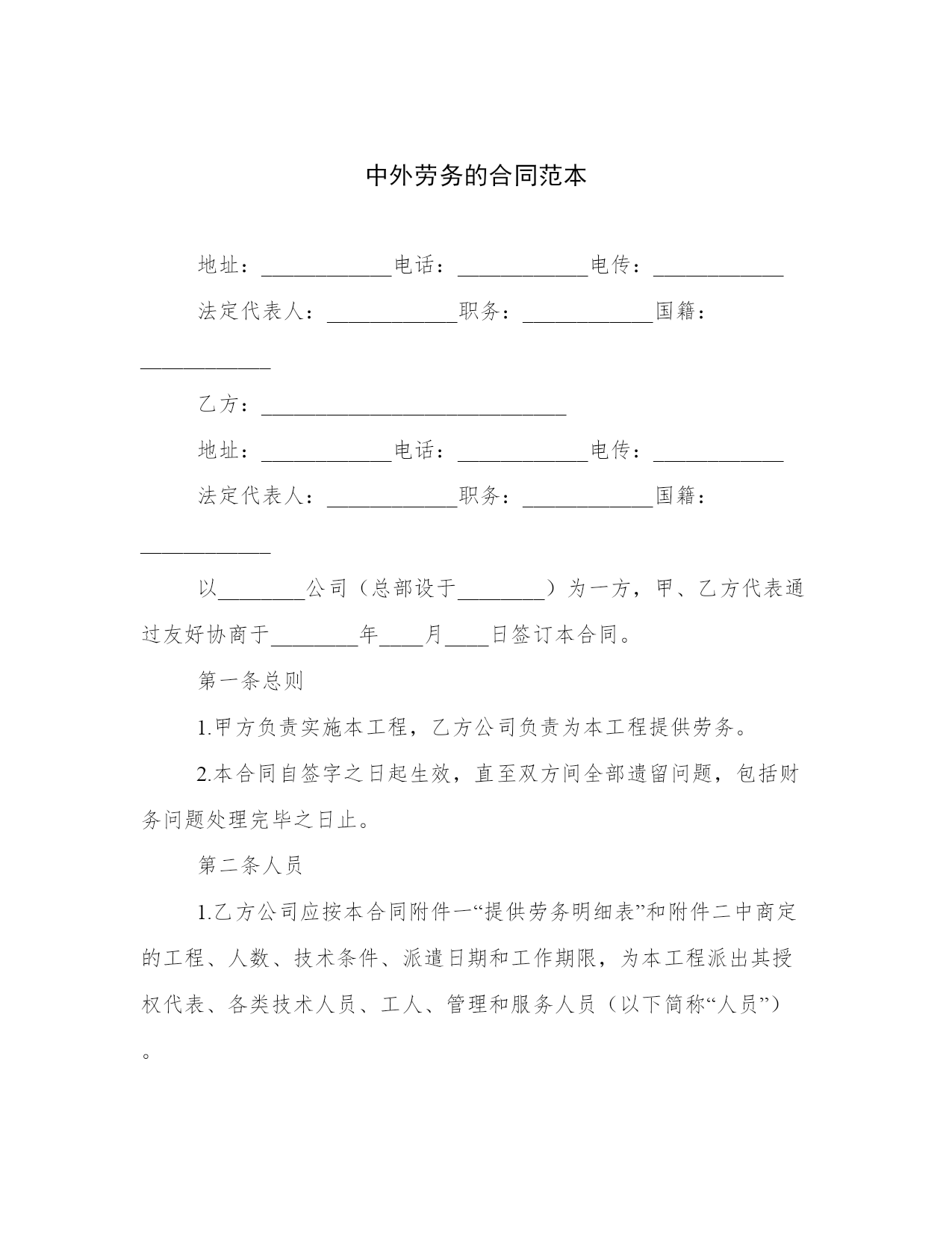 中外劳务的合同范本地址:____________电话:____________电传:____________法定代表人:____________职务:____________国籍:____________乙方:____________________________地址:____________电话:____________电传:____________法定代表人:____________职务:____________国籍:____________以________公司(总部设于________)为一方,