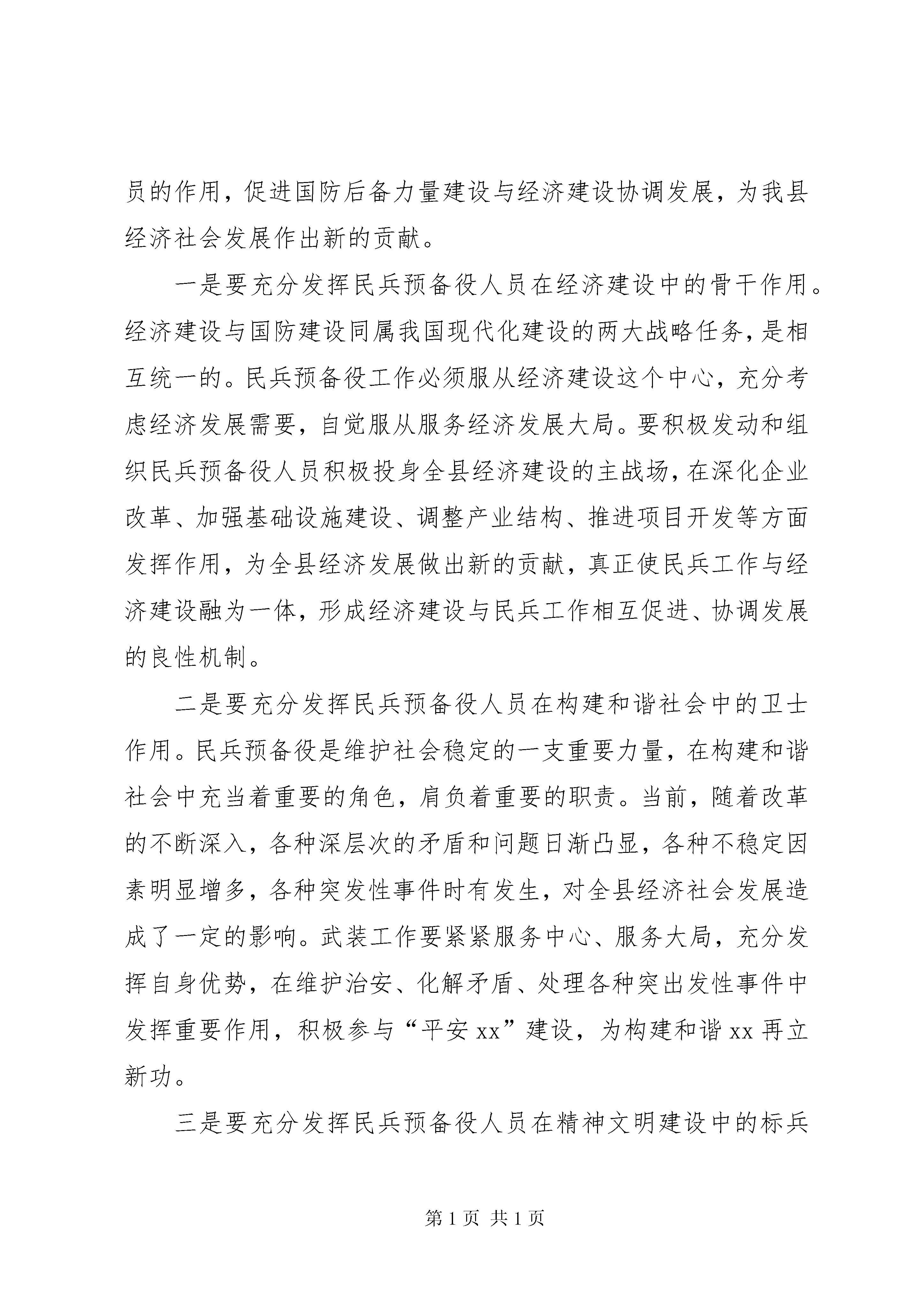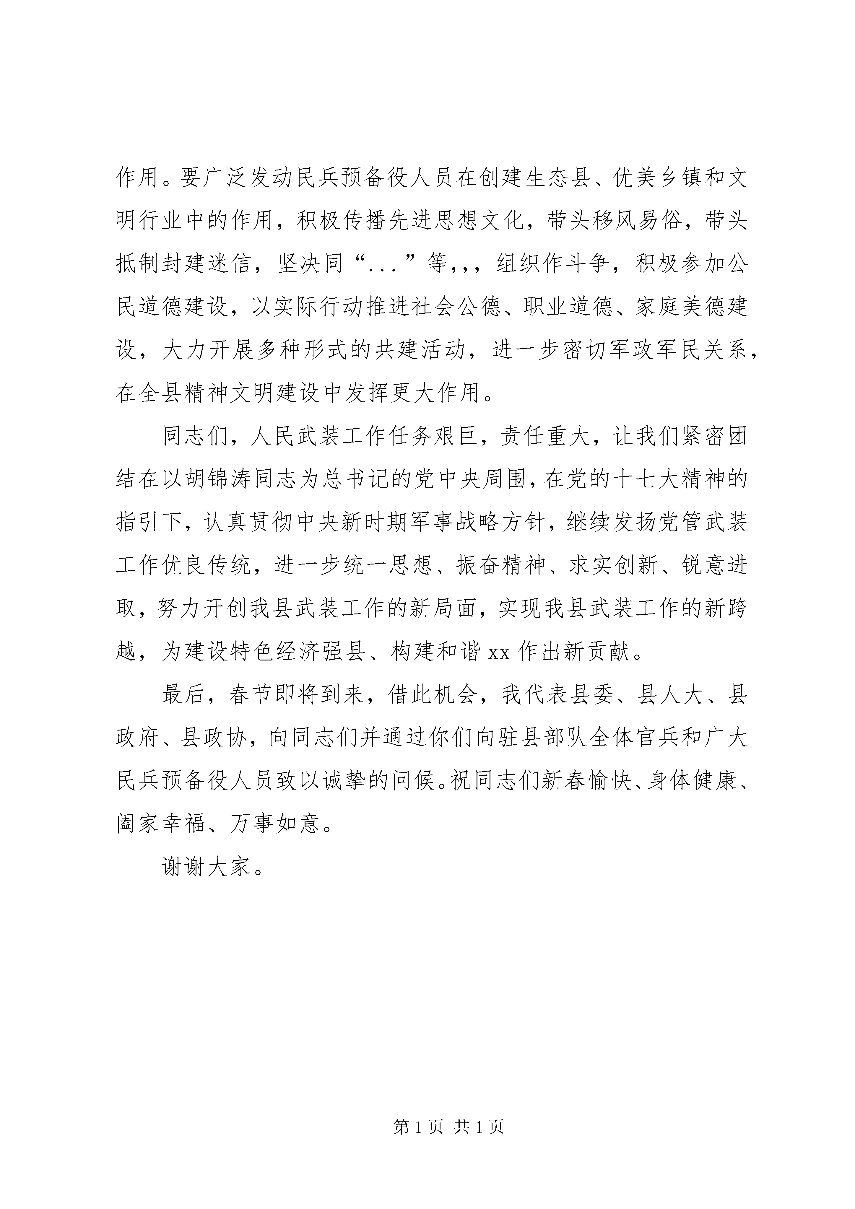 第PAGE\*Arabic\*MERGEFORMAT7页共NUMPAGES\*MERGEFORMAT7页县委书记在全县政治工作会议的讲话同志们:这次武装工作会议是面对新形势召开的一次非常重要的会议。去年,全县各级党组织和人武部按照上级关于加强国防后备力量建设的决策部署,坚持党管武装原则和从严治军方针,在真抓实干中求发展,在开拓创新中谋跨越,全县武装工作取得了可喜的成绩,特别是全县广大民兵预备役人员积极投身“三个文明”建设,在抢险救灾、扶贫帮困、处突维稳上当先锋、打头阵,为全县社会政治稳定和经济
