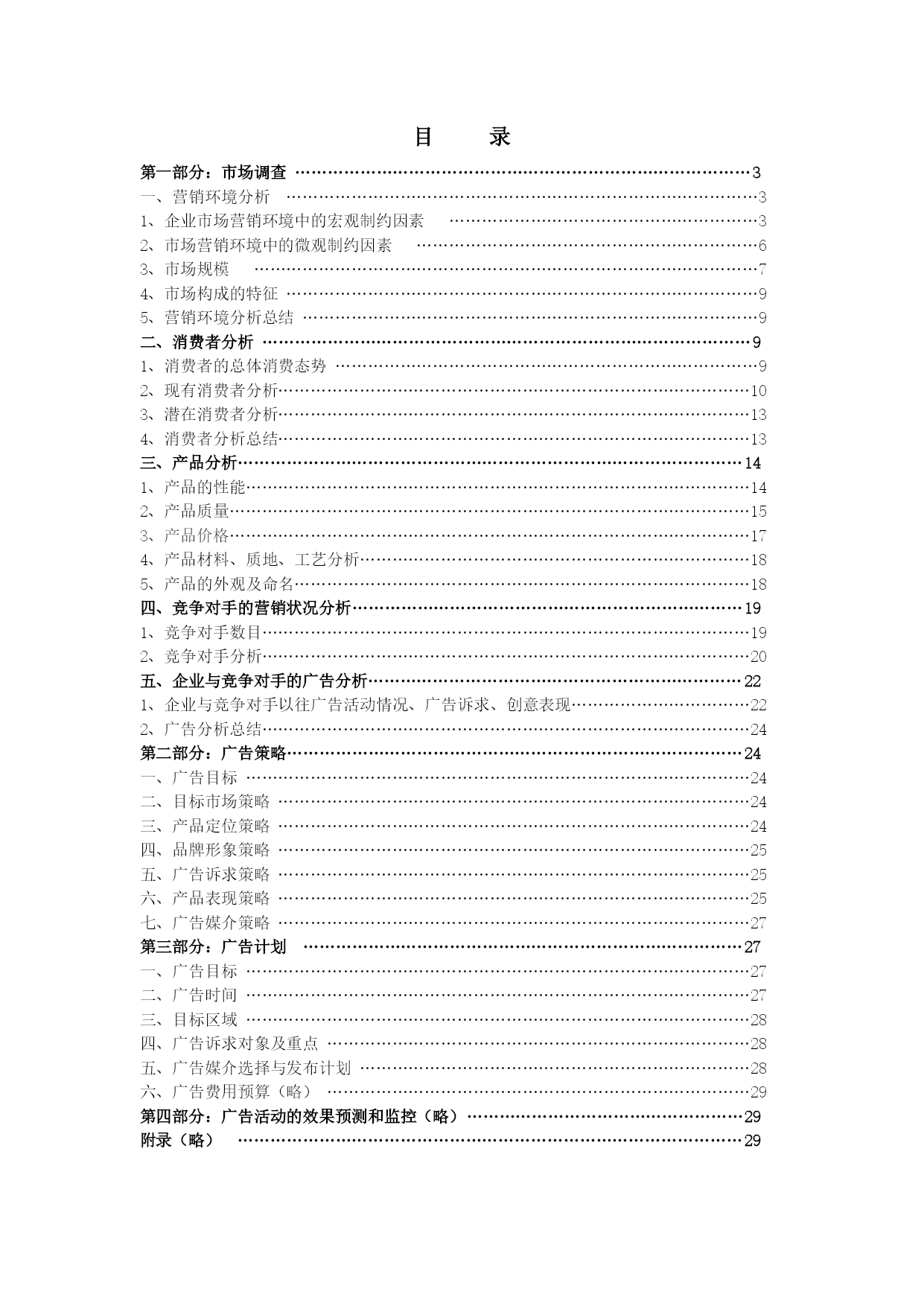 别克君威广告策划方案目录第一部分:市场调查…………………………………………………………………………3一、营销环境分析……………………………………………………………………………31、公司市场营销环境中的宏观制约因素…………………………………………………32、市场营销环境中的微观制约因素………………………………………………………63、市场规模…………………………………………………………………………………74、市场构成的特性……………………………………………………………………………95、营销环境分析总结…………