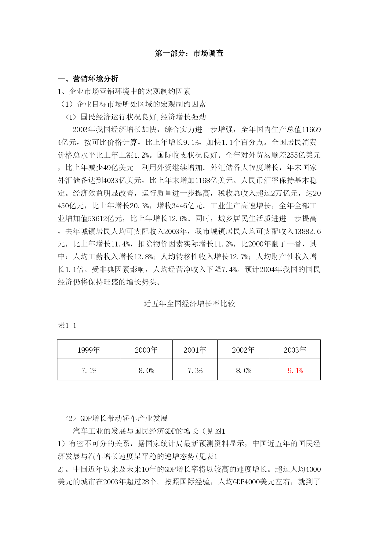 别克君威广告策划方案策划人:何毅目录第一部分:市场调查…………………………………………………………………………3一、营销环境分析……………………………………………………………………………31、企业市场营销环境中的宏观制约因素…………………………………………………32、市场营销环境中的微观制约因素………………………………………………………63、市场规模…………………………………………………………………………………74、市场构成的特征……………………………………………………………………………95、营销环境分析