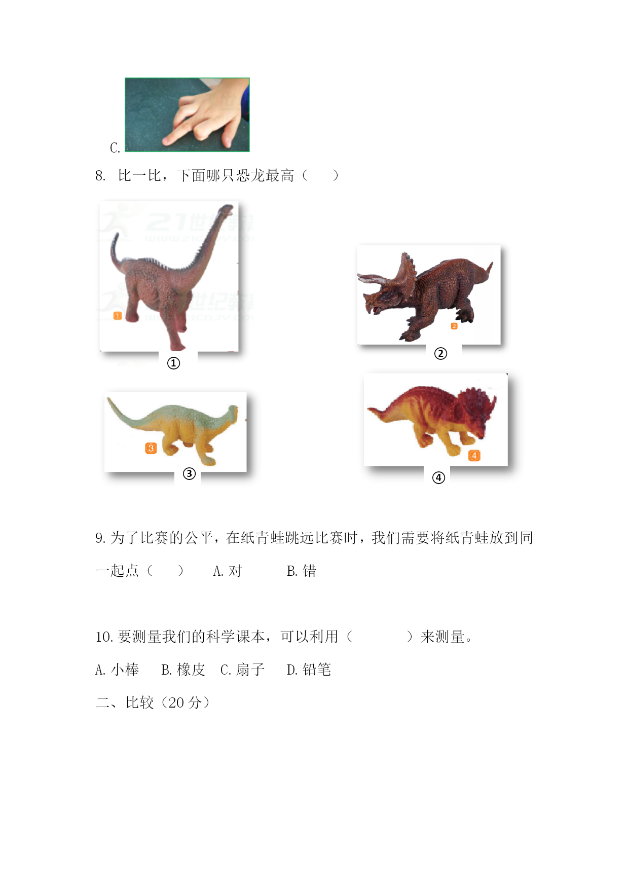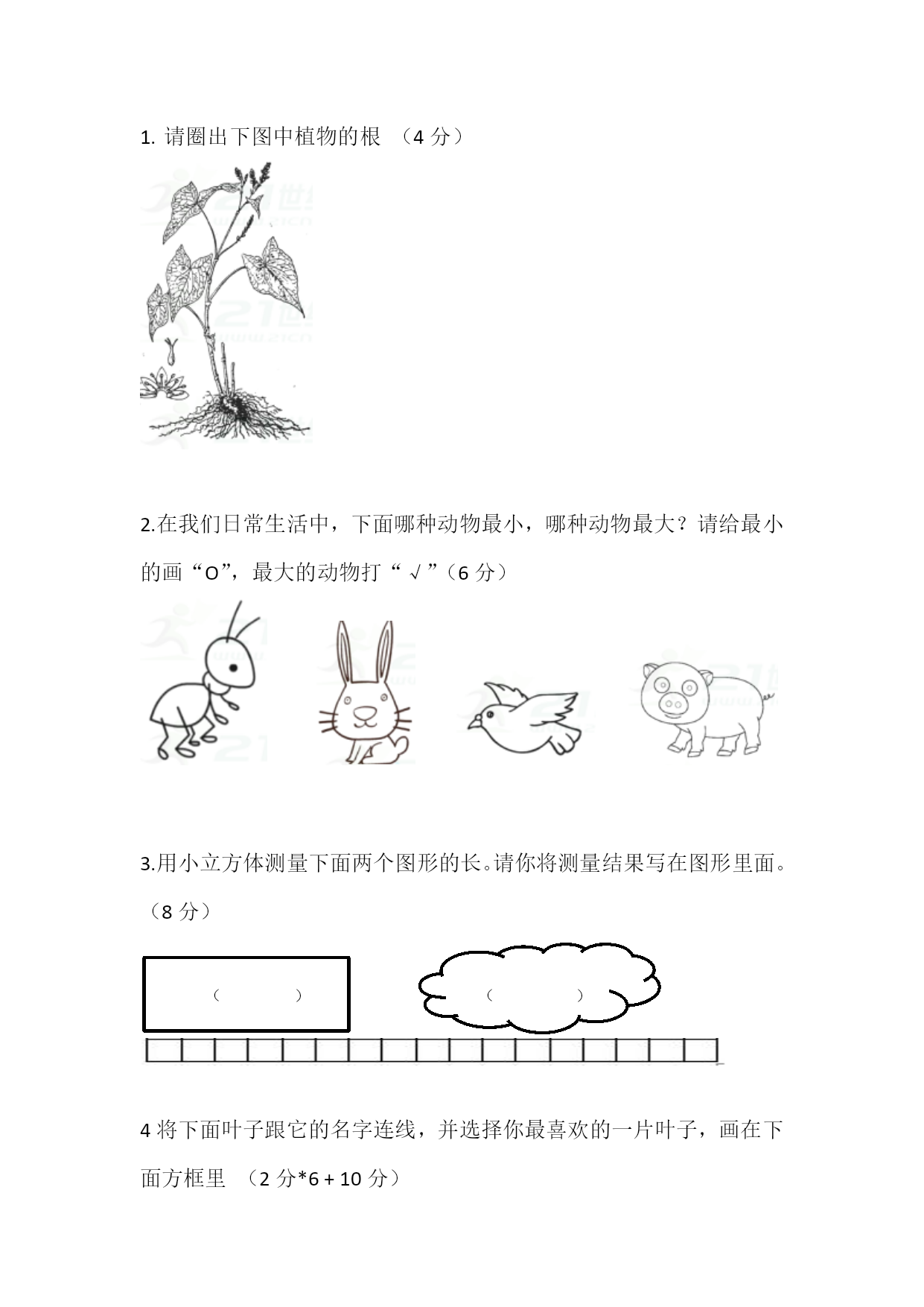 教科版一年级上册科学(教科版)期末检测试卷(考试时间:40分钟满分100分)题目一二三四五六七合计得分一、选择(30分)1.塑料花是植物。()A.对B.错2.叶子都是绿色的。()A.对B.错3.下面两片子是同一植物的叶吗?()A.是B.不是4.我想知道一株植物是什么颜色的,我需要用到()A、耳朵B、手C、眼睛5.到校园里观察和认识植物,要及时进行()A、采摘B、拔下来C、记录6.以下哪个选项不属于植物?()A、大树B、房屋C、小草7.下面的图中,哪个拃是不标准的()A.B.C.②①8.比一比,下面哪只恐龙