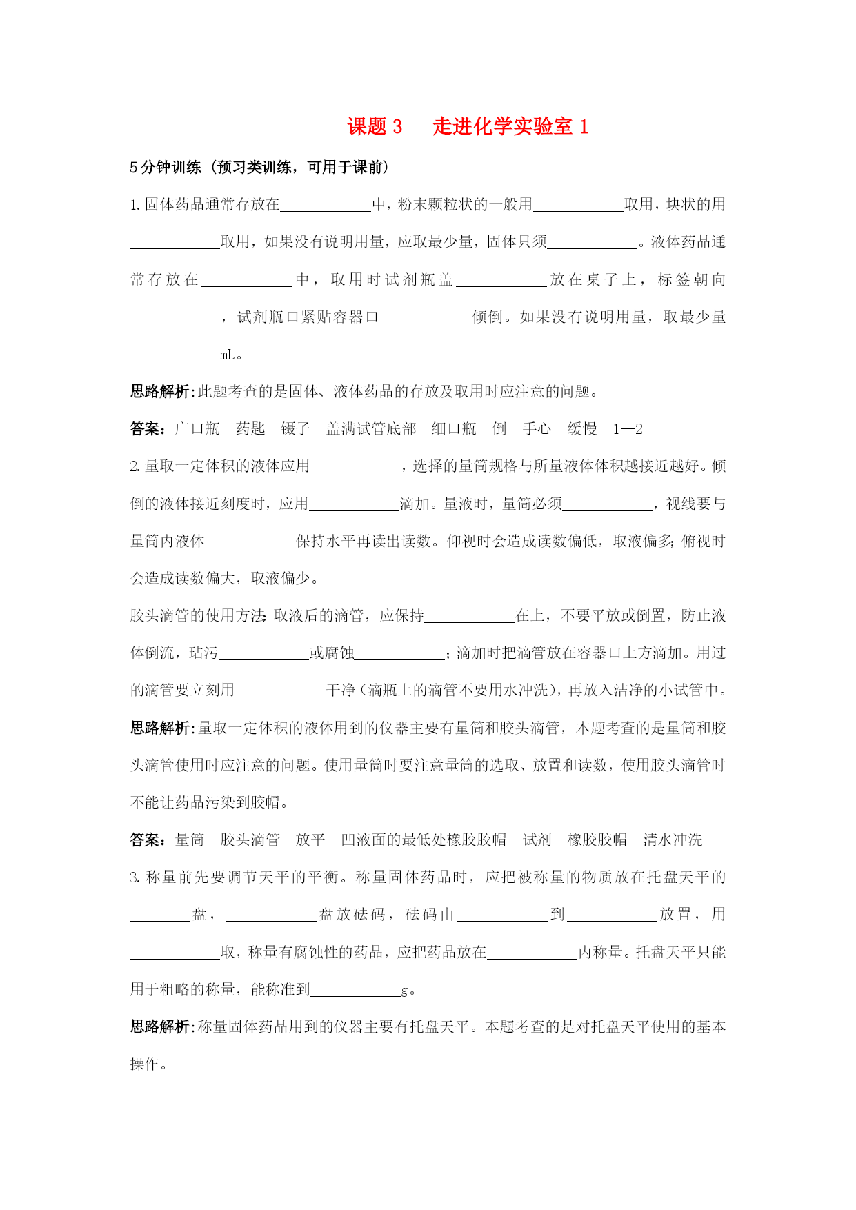 4用心爱心专心课题3走进化学实验室15分钟训练(预习类训练,可用于课前)1.固体药品通常存放在____________中,粉末颗粒状的一般用____________取用,块状的用____________取用,如果没有说明用量,应取最少量,固体只须____________。液体药品通常存放在____________中,取用时试剂瓶盖____________放在桌子上,标签朝向____________,试剂瓶口紧贴容器口____________倾倒。如果没有说明用量,取最少量_______