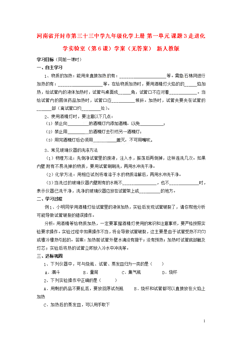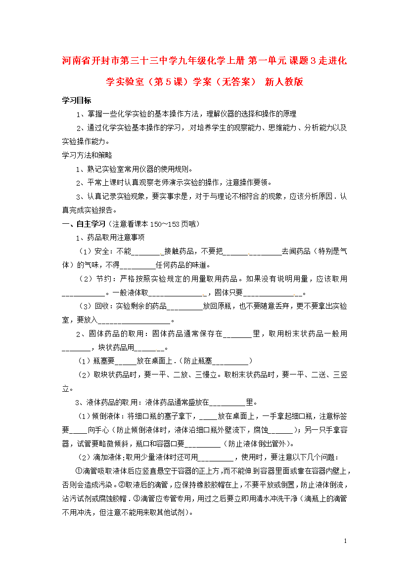 1河南省开封市第三十三中学九年级化学上册第一单元课题3走进化学实验室(第5课)学案(无答案)新人教版学习目标1、掌握一些化学实验的基本操作方法,理解仪器的选择和操作的原理2、通过化学实验基本操作的学习,对培养学生的观察能力、思维能力、分析能力以及实验操作能力。学习方法和策略1、熟记实验室常用仪器的使用规则。2、平常上课时认真观察老师演示实验的操作,注意操作要领。3、认真记录实验现象,要实事求是,对于与理论不相符合的现象,应该分析原因.认真完成实验报告。一、自主学习(注意看课