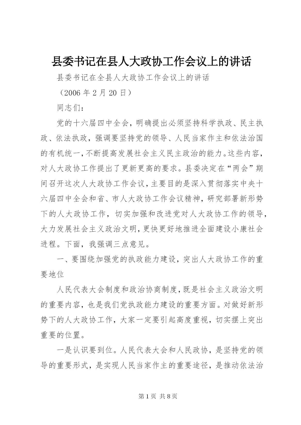 县委书记在县人大政协工作会议上的讲话县委书记在县人大政协工作会议上的讲话县委书记在全县人大政协工作会议上的讲话(2006年2月20日)同志们:党的十六届四中全会,明确提出必须坚持科学执政、民主执政、依法执政,强调要坚持党的领导、人民当家作主和依法治国的有机统一,不断提高发展社会主义民主政治的能力。这些内容,对人大政协工作提出了更新更高的要求。县委决定在“两会”期间召开这次人大政协工作会议,主要目的是深入贯彻落实中央十六届四中全会和省、市人大政协工作会议精神,研究部署新形势下的人大
