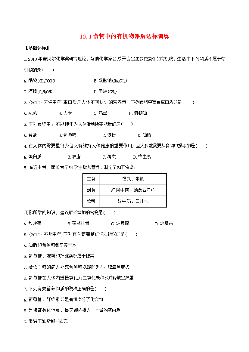 10.1食物中的有机物课后达标训练【基础达标】1.2010年诺贝尔化学奖研究理论,帮助化学家合成开发出更多更复杂的有机物,生活中下列物质不属于有机物的是()A.醋酸(CH3COOH)B.碳酸钠(Na2CO3)C.酒精(C2H5OH)D.甲烷(CH4)2.(2012·天津中考)蛋白质是人体不可缺少的营养素,下列食物中富含蛋白质的是()A.蔬菜B.大米C.鸡蛋D.植物油3.下列食物中,不能转化为人体活动所需能量的是()A.食盐B.葡萄糖C.淀粉D.油脂4.在人体内需要量很少但又有维持人体健康的重要作用,且大多
