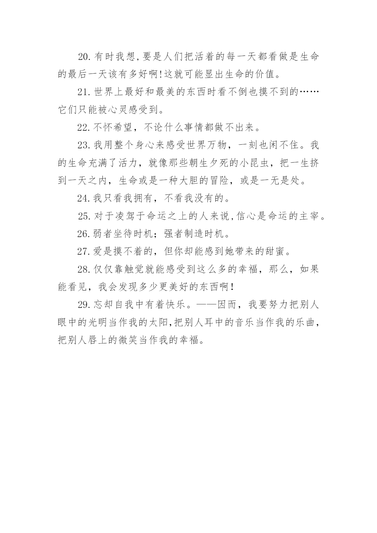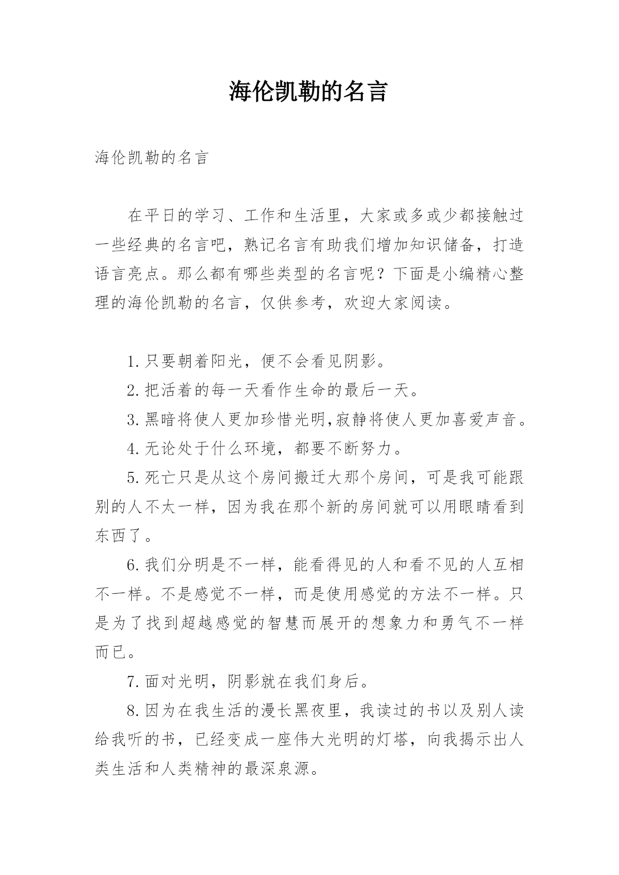 海伦凯勒的名言海伦凯勒的名言在平日的学习、工作和生活里,大家或多或少都接触过一些经典的名言吧,熟记名言有助我们增加知识储备,打造语言亮点。那么都有哪些类型的名言呢?下面是小编精心整理的海伦凯勒的名言,仅供参考,欢迎大家阅读。1.只要朝着阳光,便不会看见阴影。2.把活着的每一天看作生命的最后一天。3.黑暗将使人更加珍惜光明,寂静将使人更加喜爱声音。4.无论处于什么环境,都要不断努力。5.死亡只是从这个房间搬迁大那个房间,可是我可能跟别的人不太一样,因为我在那个新的房间就可以用眼睛看到东西了。6.我们分明是不