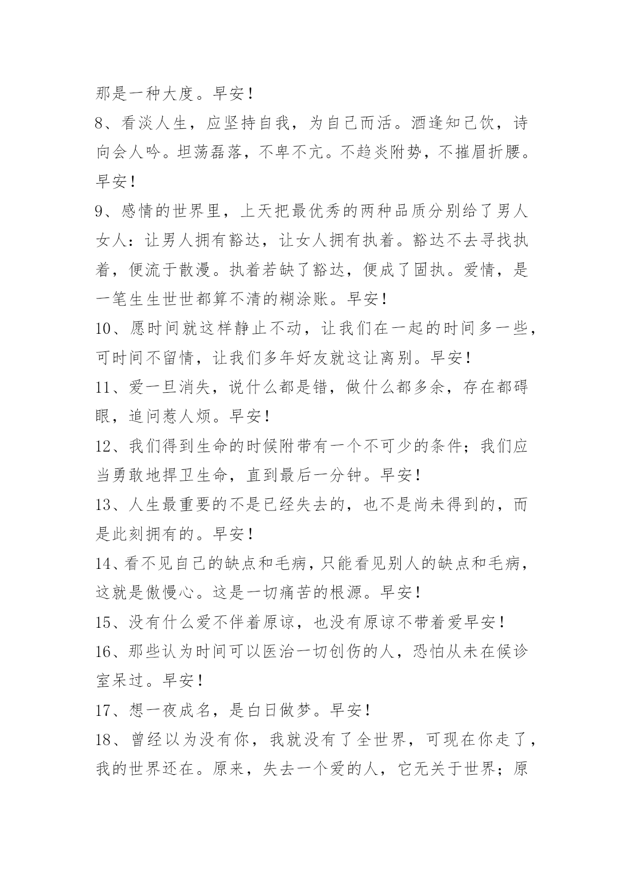 新版早安问候语语录新版早安问候语语录39句想浪漫一辈子,首先得学会爱自己。早安!以下是小编搜索整理的新版早安问候语39句,希望能够帮助到大家。1、有些决定,只需要一分钟,可是,却会用一辈子,去后悔那一分钟。早安!2、没有人能够唱得像那些处于地狱最深处的人那样纯洁。早安!3、一个人只要选对了路,下定了成功的决心,"精进不止",终能成功。当然,这是一个艰难的过程,需要始终保持至诚之心,永不动摇,才能心想事成。早安!4、这些年看开了许多事情,没什么非你不可,也没什么不可失去。愿意留下来的就好好相处;想要远走的,
