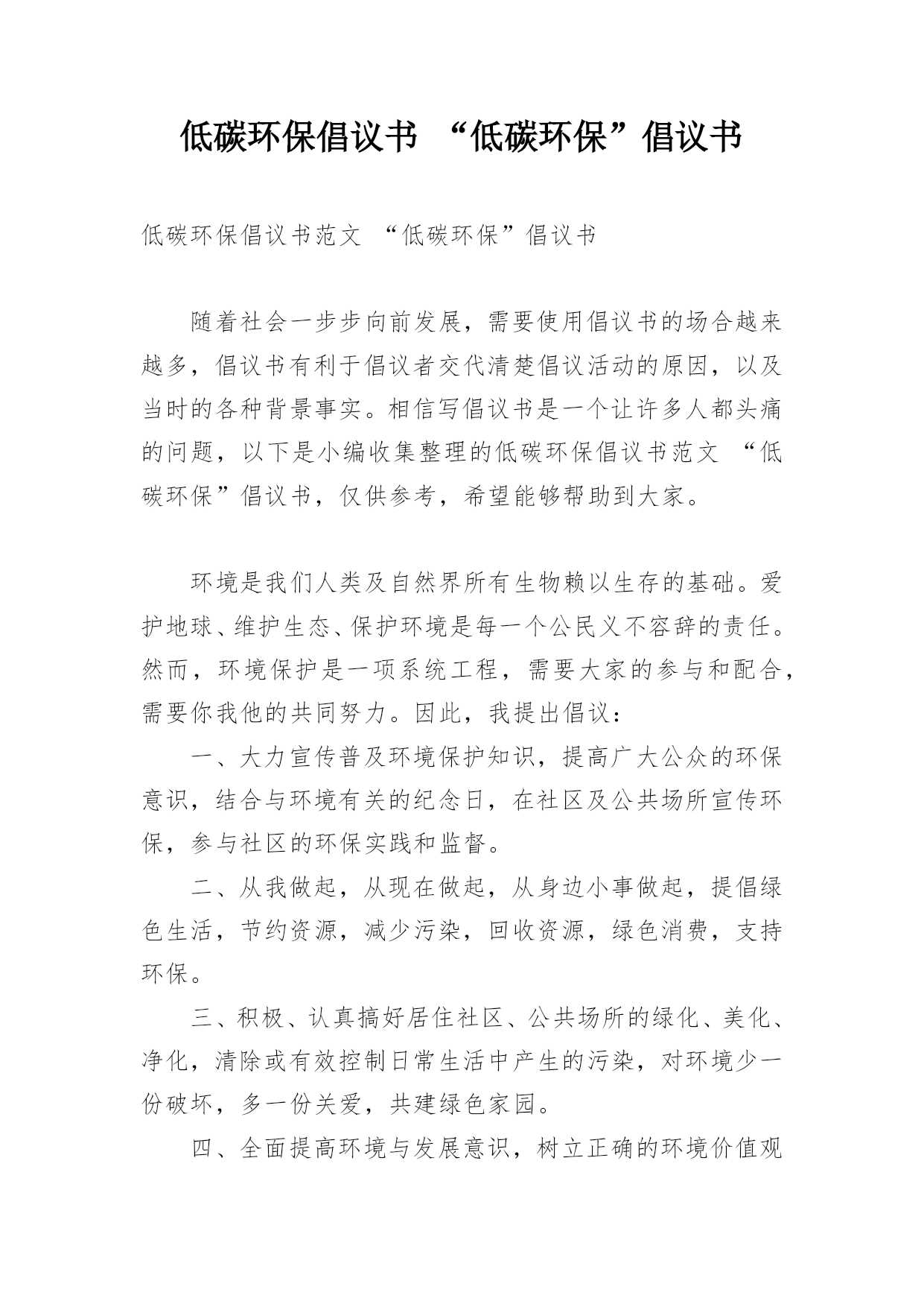 低碳环保倡议书“低碳环保”倡议书低碳环保倡议书范文“低碳环保”倡议书随着社会一步步向前发展,需要使用倡议书的场合越来越多,倡议书有利于倡议者交代清楚倡议活动的原因,以及当时的各种背景事实。相信写倡议书是一个让许多人都头痛的问题,以下是小编收集整理的低碳环保倡议书范文“低碳环保”倡议书,仅供参考,希望能够帮助到大家。环境是我们人类及自然界所有生物赖以生存的基础。爱护地球、维护生态、保护环境是每一个公民义不容辞的责任。然而,环境保护是一项系统工程,需要大家的参与和配合,需要你我他的共同努力。因此,我提出倡议: