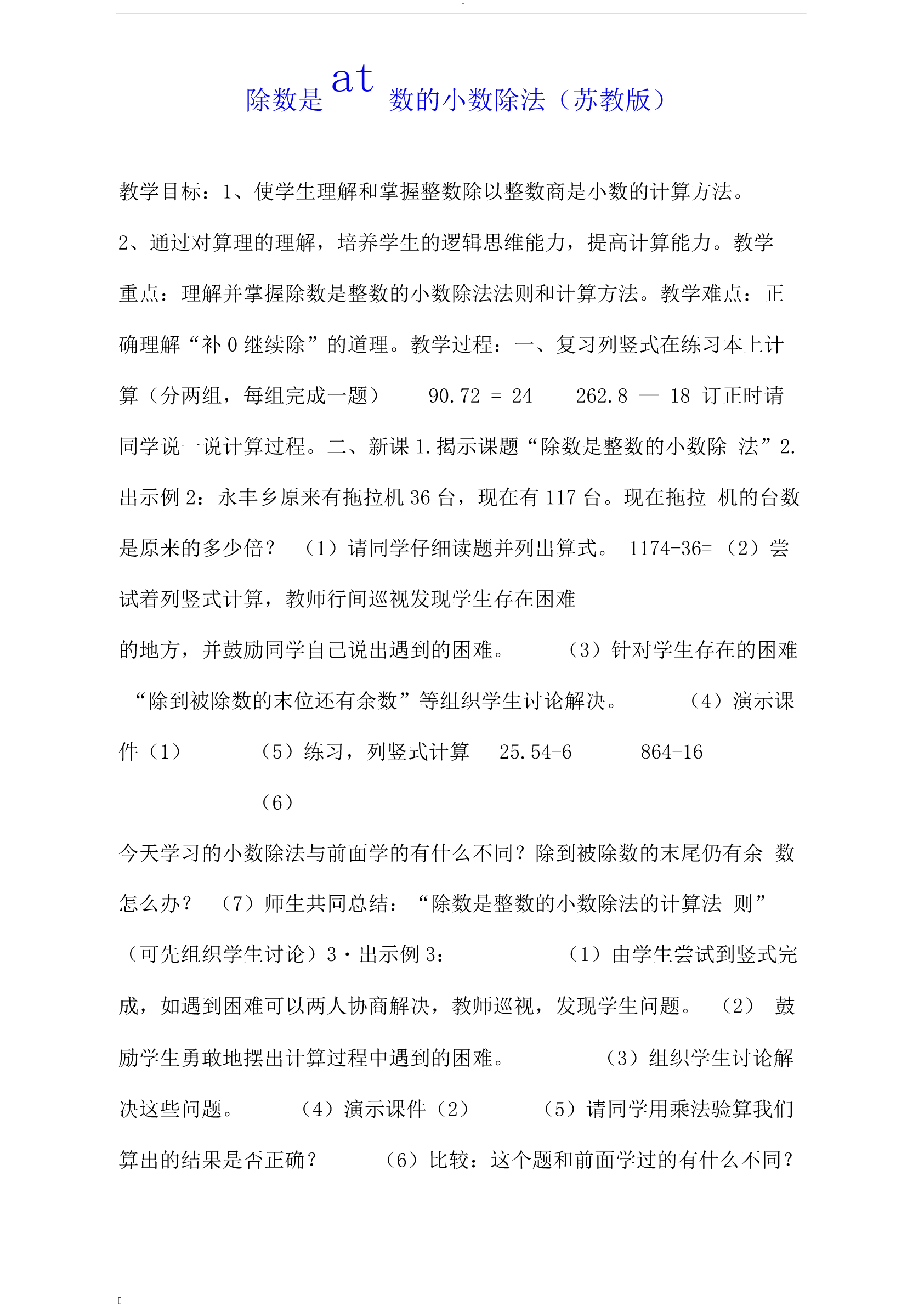 除数是at数的小数除法(苏教版)教学目标:1、使学生理解和掌握整数除以整数商是小数的计算方法。2、通过对算理的理解,培养学生的逻辑思维能力,提高计算能力。教学重点:理解并掌握除数是整数的小数除法法则和计算方法。教学难点:正确理解“补0继续除”的道理。教学过程:一、复习列竖式在练习本上计算(分两组,每组完成一题)90.72=24262.8—18订正时请同学说一说计算过程。二、新课1.揭示课题“除数是整数的小数除法”2.出示例2:永丰乡原来有拖拉机36台,现在有117台。现在拖拉机的台数是原来的多少倍?(1)
