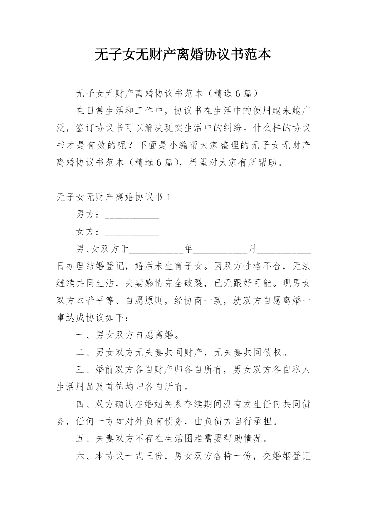无子女无财产离婚协议书范本无子女无财产离婚协议书范本(精选6篇)在日常生活和工作中,协议书在生活中的使用越来越广泛,签订协议书可以解决现实生活中的纠纷。什么样的协议书才是有效的呢?下面是小编帮大家整理的无子女无财产离婚协议书范本(精选6篇),希望对大家有所帮助。无子女无财产离婚协议书1男方:___________女方:___________男、女双方于___________年___________月___________日办理结婚登记,婚后未生育子女。因双方性格不合,无法继续共同生活,夫妻感情完全破裂,已