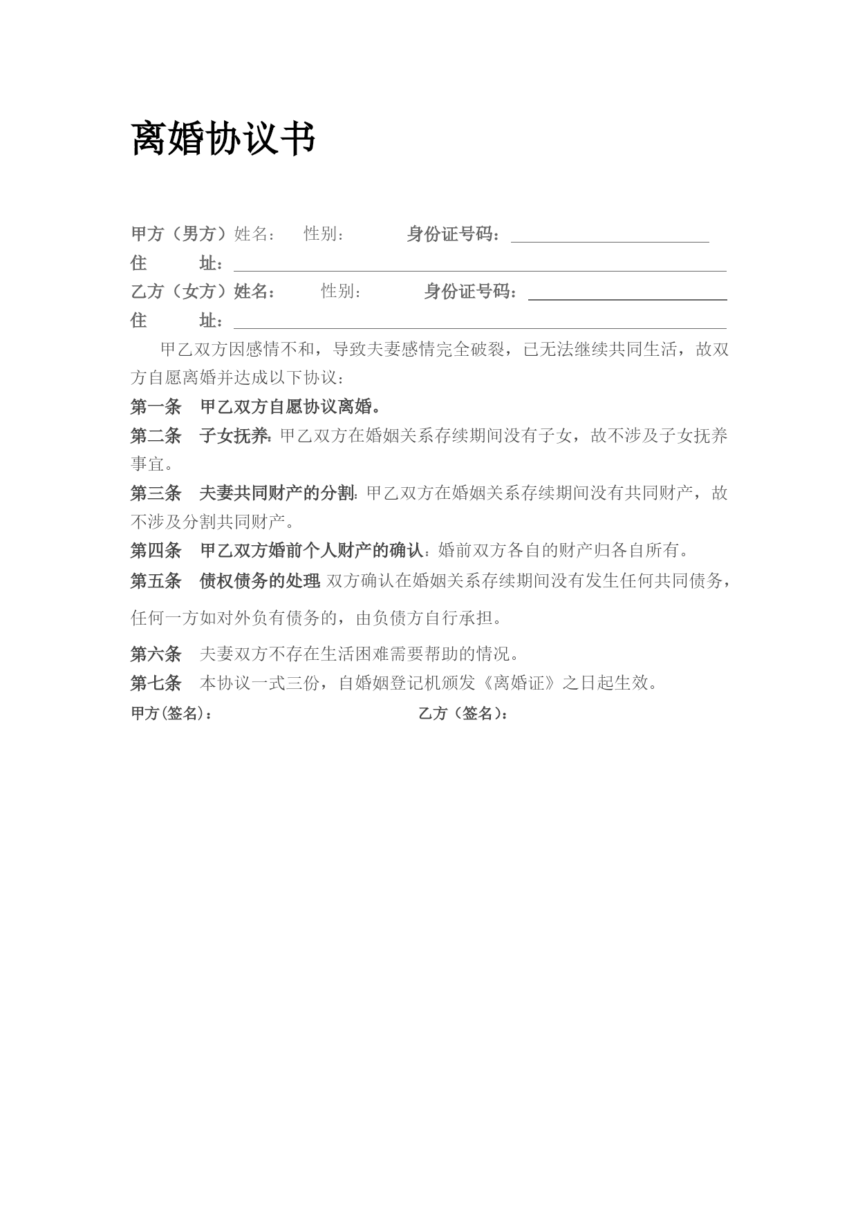 离婚协议书甲方(男方)姓名:性别:身份证号码:住址:乙方(女方)姓名:性别:身份证号码:住址:甲乙双方因感情不和,导致夫妻感情完全破裂,已无法继续共同生活,故双方自愿离婚并达成以下协议:第一条甲乙双方自愿协议离婚。第二条子女抚养:甲乙双方在婚姻关系存续期间没有子女,故不涉及子女抚养事宜。第三条夫妻共同财产的分割:甲乙双方在婚姻关系存续期间没有共同财产,故不涉及分割共同财产。第四条甲乙双方婚前个人财产的确认:婚前双方各自的财产归各自所有。第五条债权债务的处理:双方确认在婚姻关系存续期间没有发生任何共同债务,