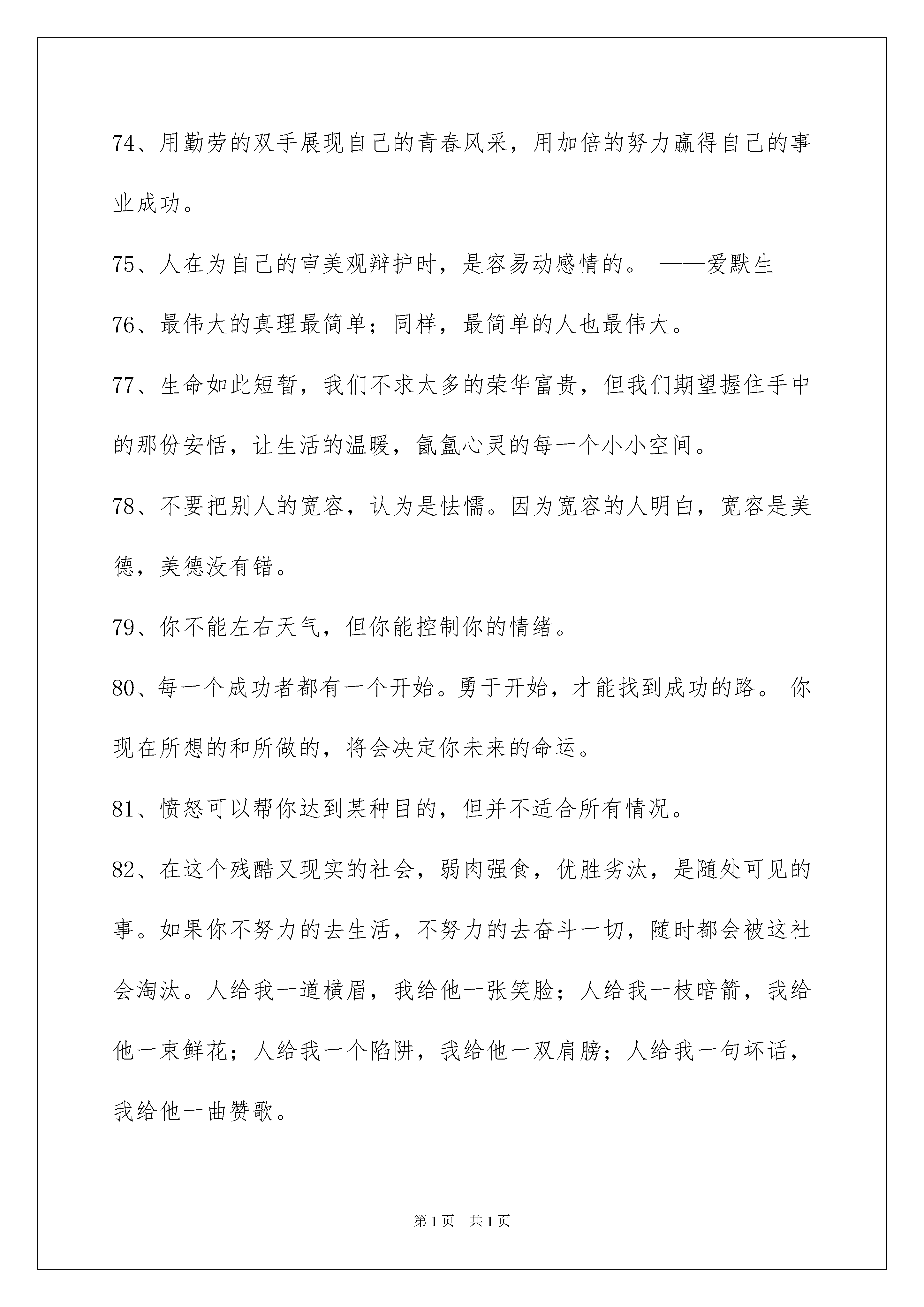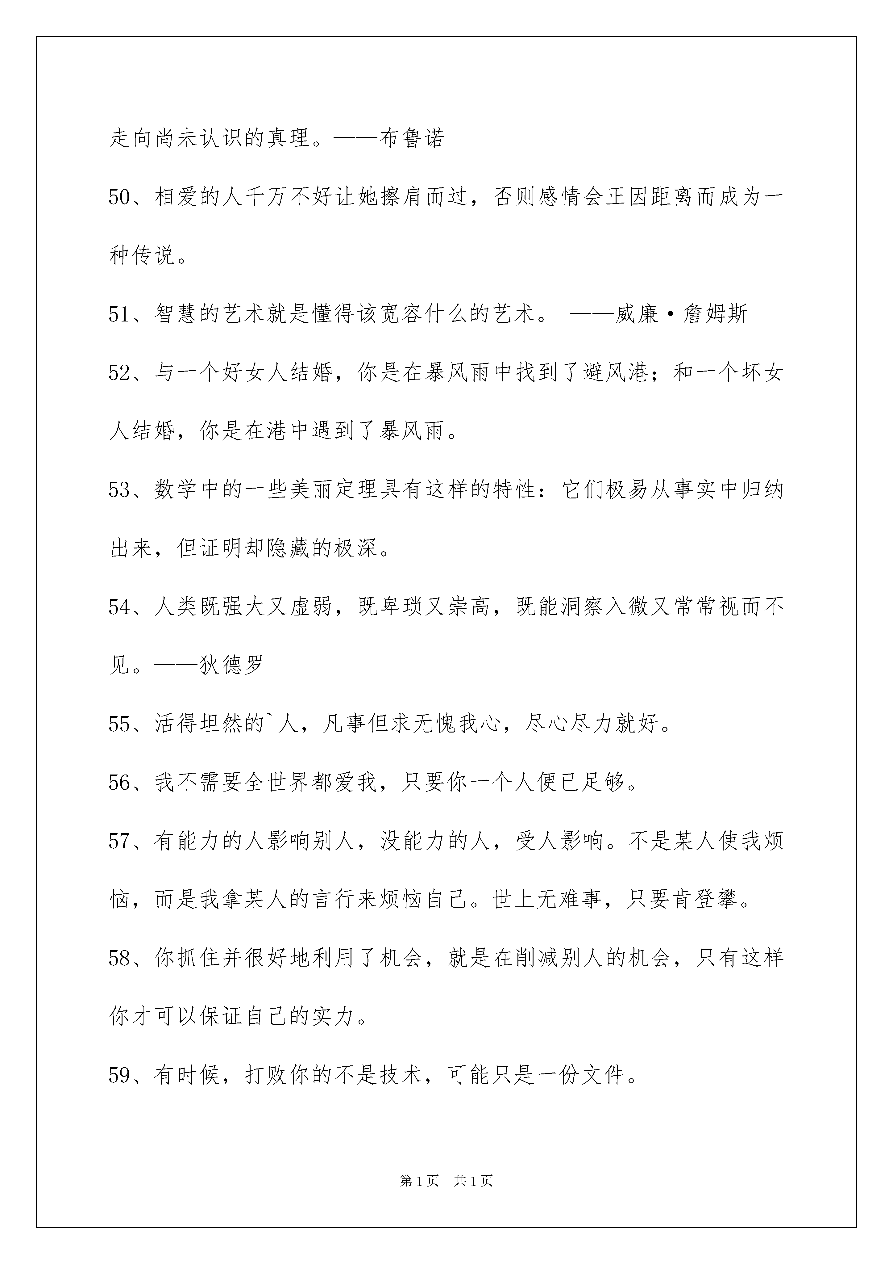 2022简洁的人生格言警句锦集99条简洁的人生格言警句锦集99条要做人间的鼓舞者不做他人的怜悯者。下面是我精心整理的人生格言警句99条希望大家喜欢。1、意志的力量是无限的除非我们有意去限定它。2、只有把人对人的关系即一个人对另