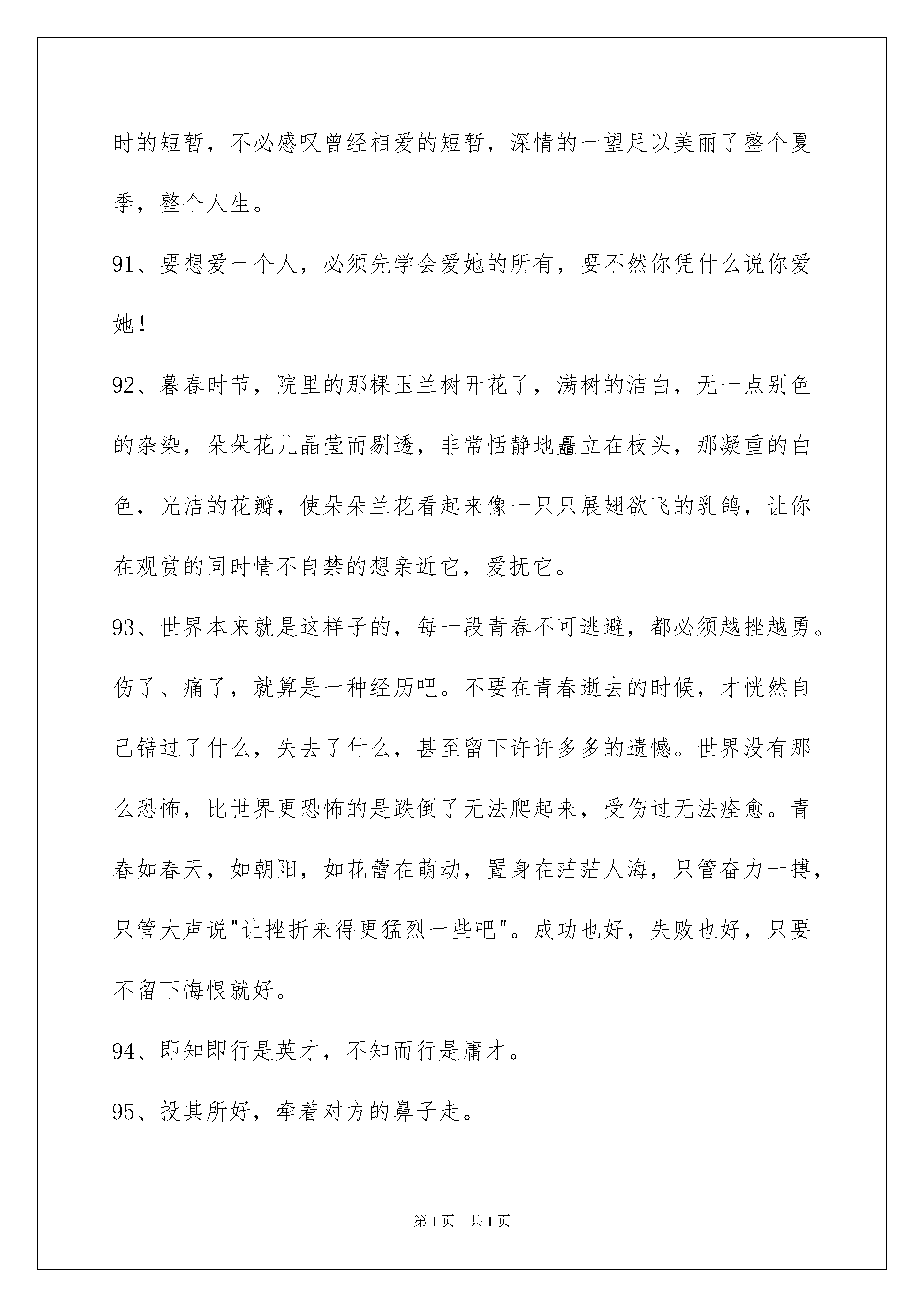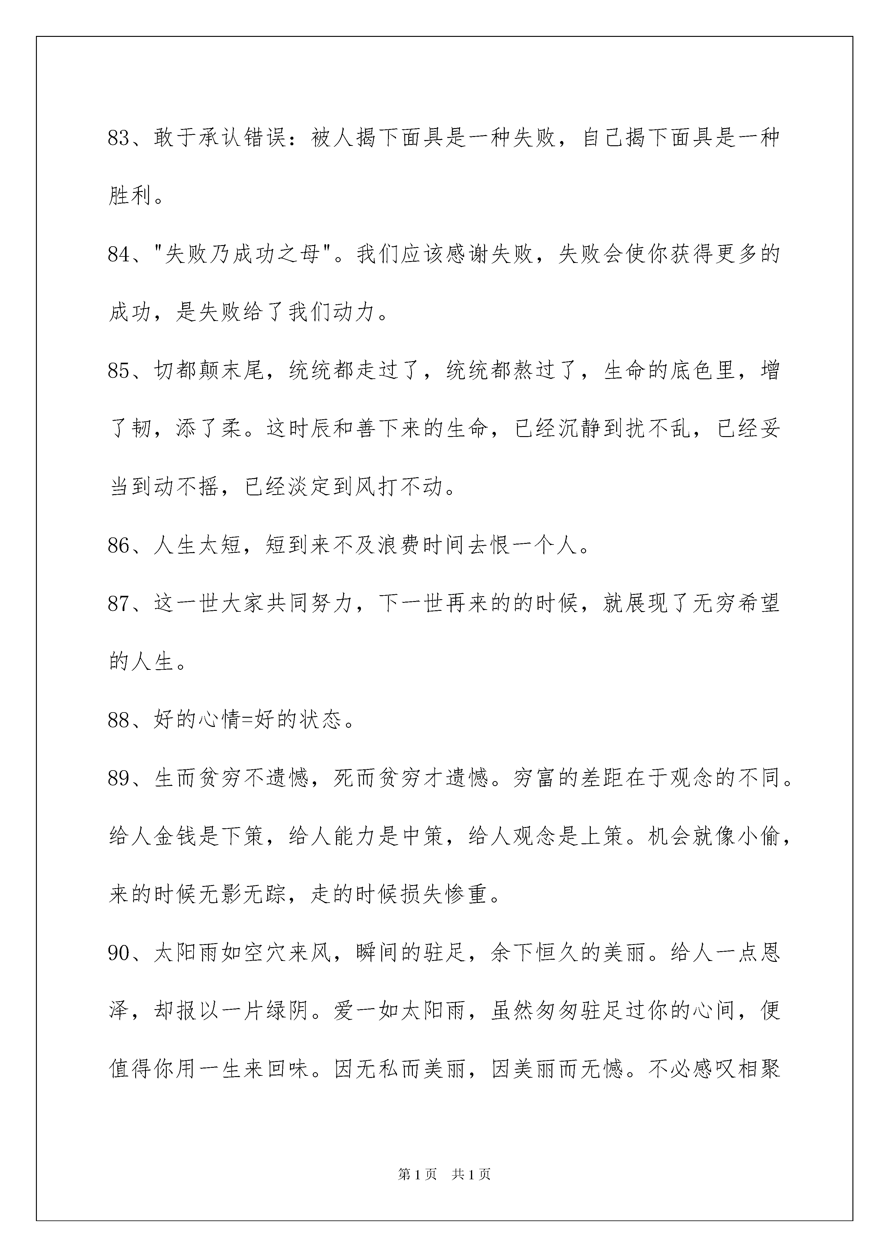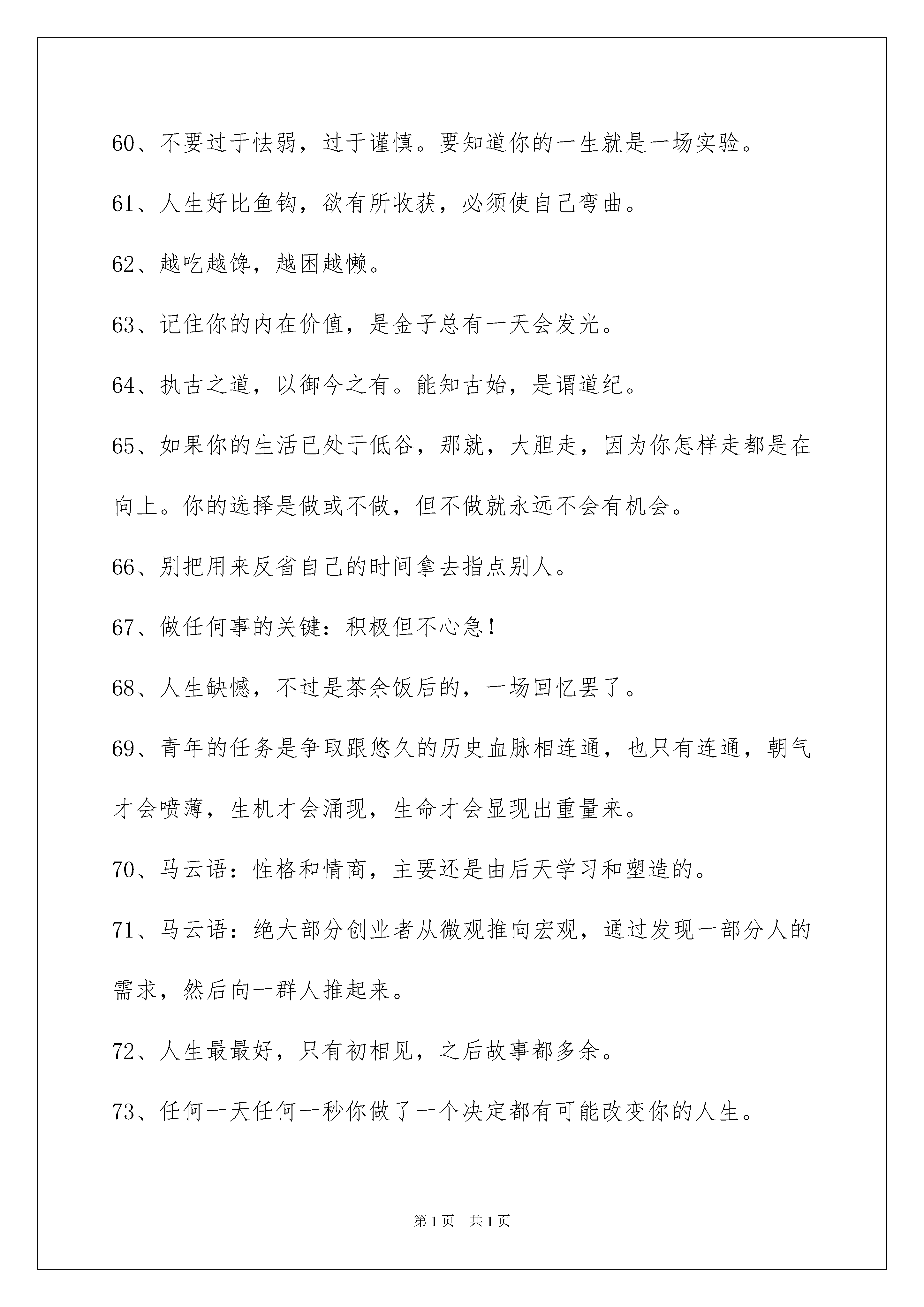 2022年简洁的人生格言警句锦集96条1、人生的路虽然很长,但对于我,决不能令其荒废。2、不要伤心!失败是保护作家的天使,失败可以使作家超出琐碎事物之上,使他免于粘上自命不凡的灰尘,陷入自我崇拜的泥泞,使他避免一切肮脏的东西。3、艰苦的事业里寓有光荣,但是甜蜜的生活也有它的价值。正是为了生活的甜蜜和它的价值,才更需要艰苦奋斗。4、时间只是我垂钓的溪流。我喝着它,喝小时我看到,那河的底层多么浅啊。它的汩汩流水逝去了,可是永恒留了下来。——[英国]勃朗宁5、家庭是社会的一个天然的基层细胞,人类的美好生活在这里