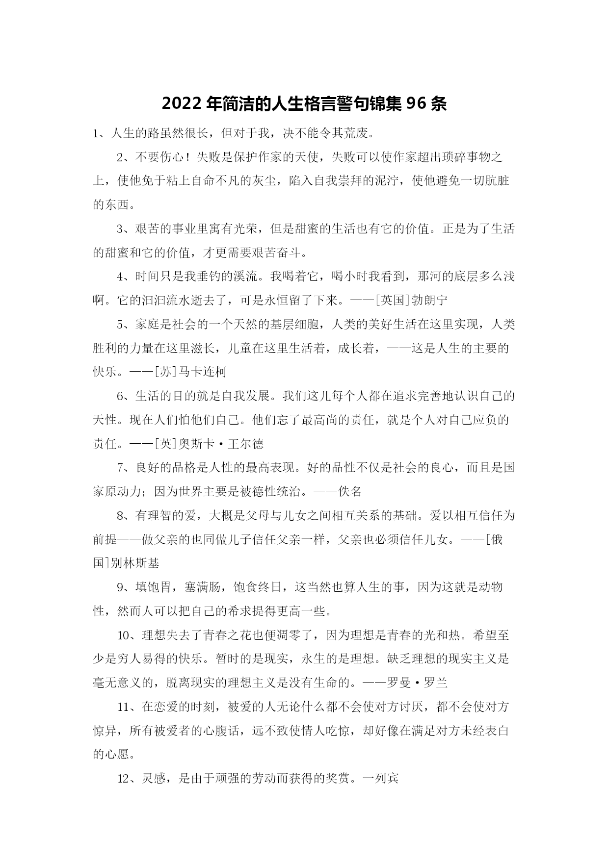 2022简洁的人生格言警句锦集99条简洁的人生格言警句锦集99条要做人间的鼓舞者,不做他人的怜悯者。下面是我精心整理的人生格言警句99条,希望大家喜欢。1、意志的力量是无限的,除非我们有意去限定它。2、只有把人对人的关系即一个人对另一个人的关系、我对你的关系加以考察时,才能谈得上道德;只有把对自己的义务认为是对他人的直接义务,只有承认我对于自己有义务