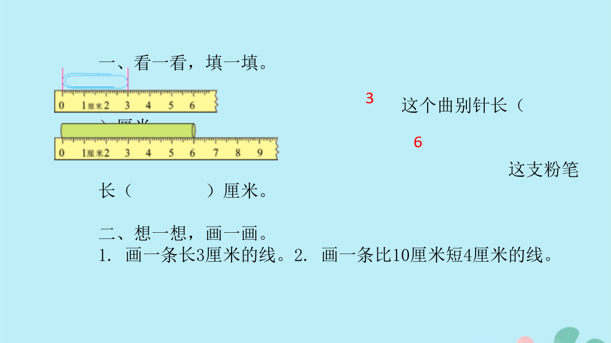 第六单元测量课时2课桌有多长一、看一看填一填。这个曲别针长()厘米。这支粉笔长()厘米。二、想一想画一画。1.画一条长3厘米的线。2.画一条比10厘米短4厘米的线。三、(易错)想一想填一填。这根铁钉长()厘米。