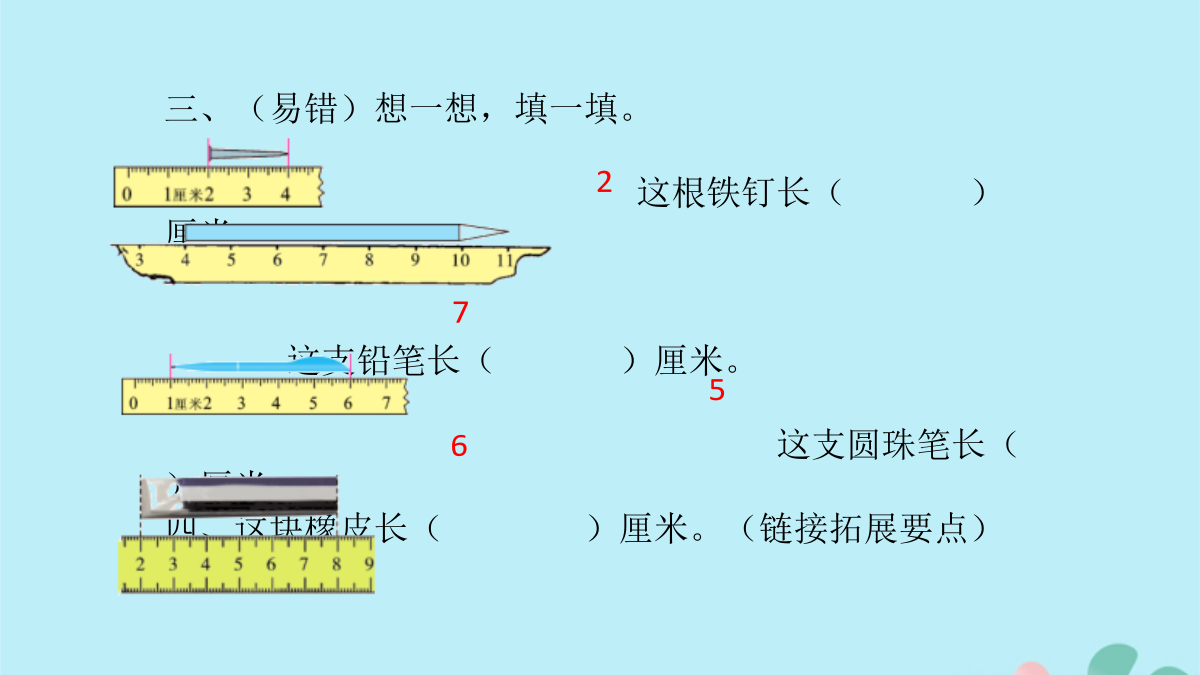 第六单元测量课时2课桌有多长一、看一看,填一填。这个曲别针长()厘米。这支粉笔长()厘米。二、想一想,画一画。1.画一条长3厘米的线。2.画一条比10厘米短4厘米的线。三、(易错)想一想,填一填。这根铁钉长()厘米。这支铅笔长()厘米。这支圆珠笔长()厘米。四、这块橡皮长()厘米。(链接拓展要点)