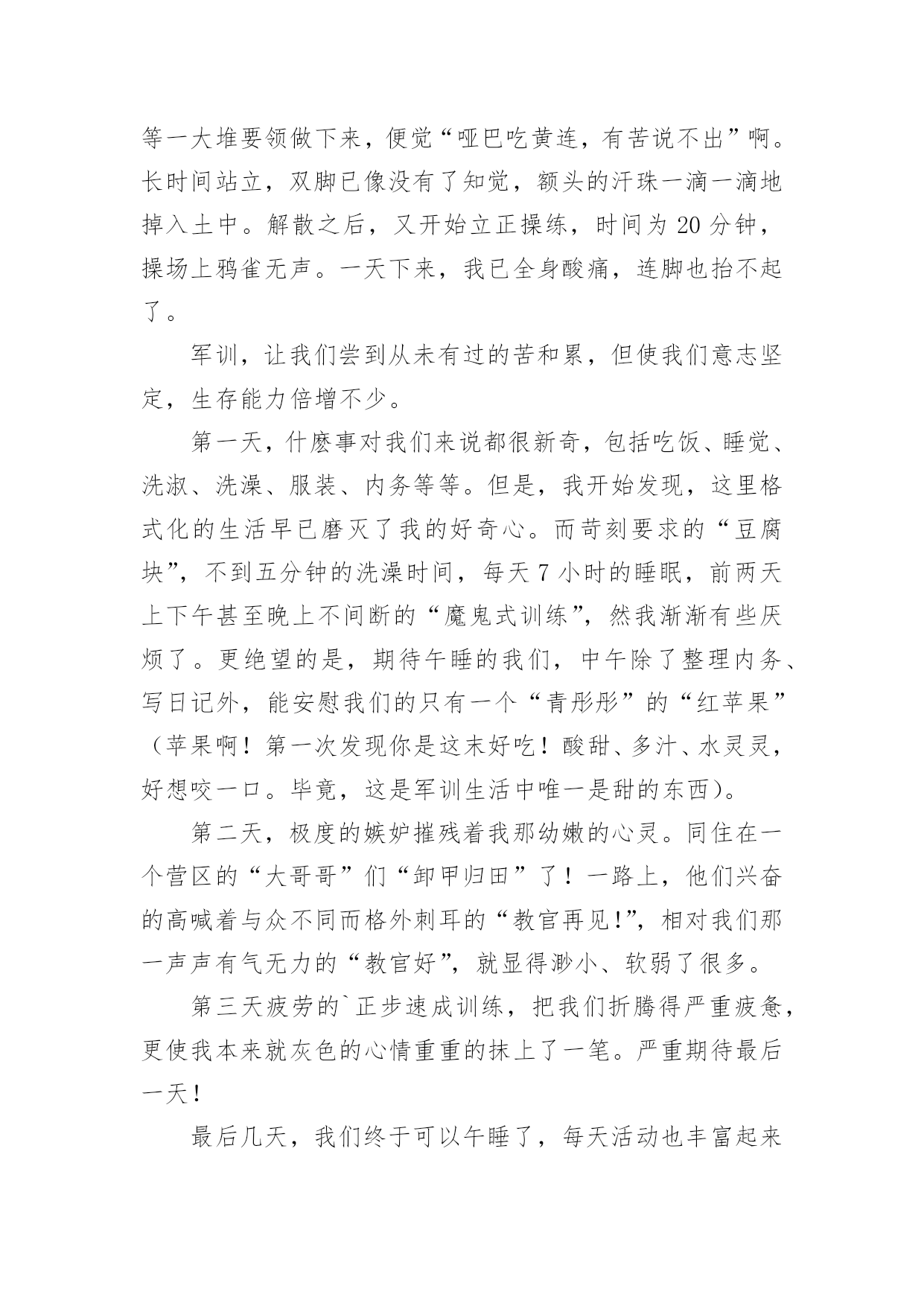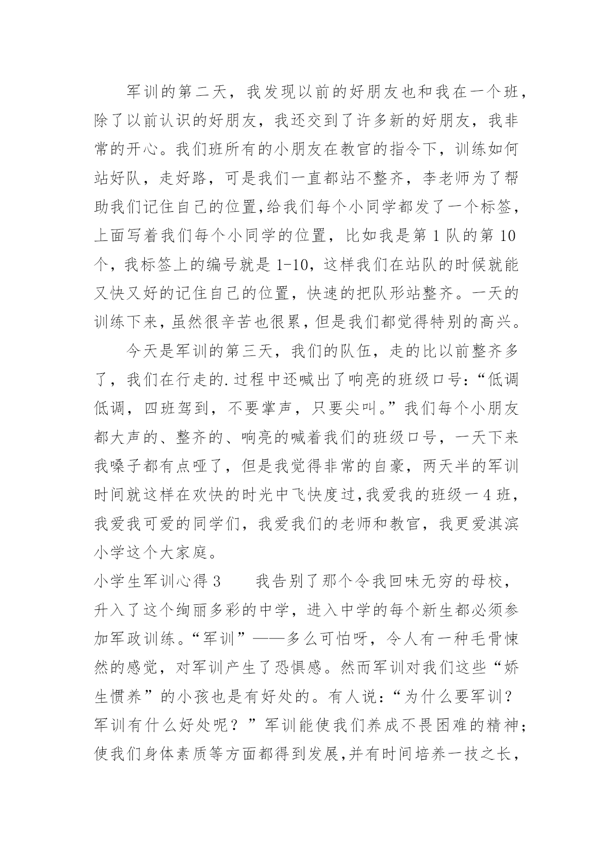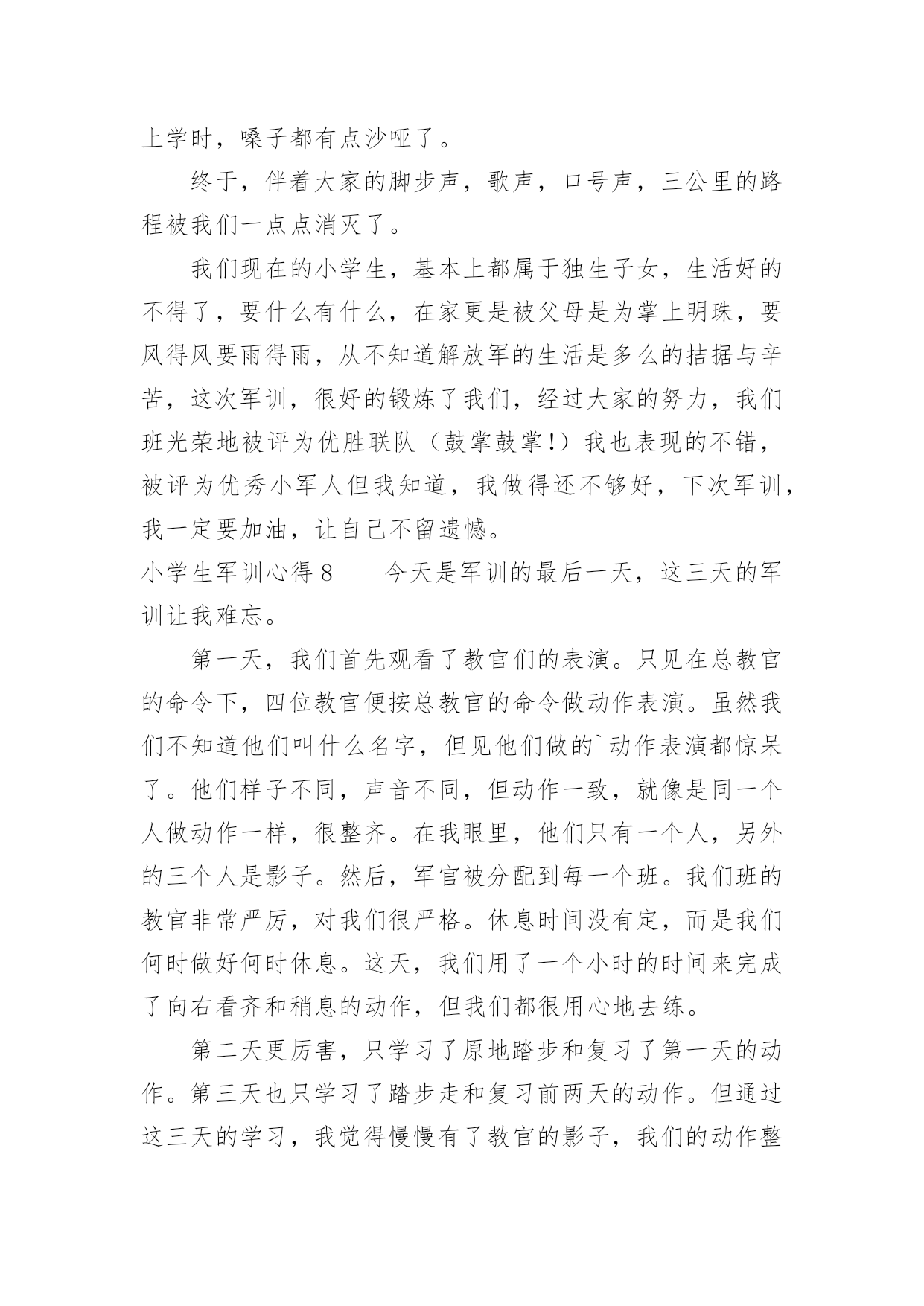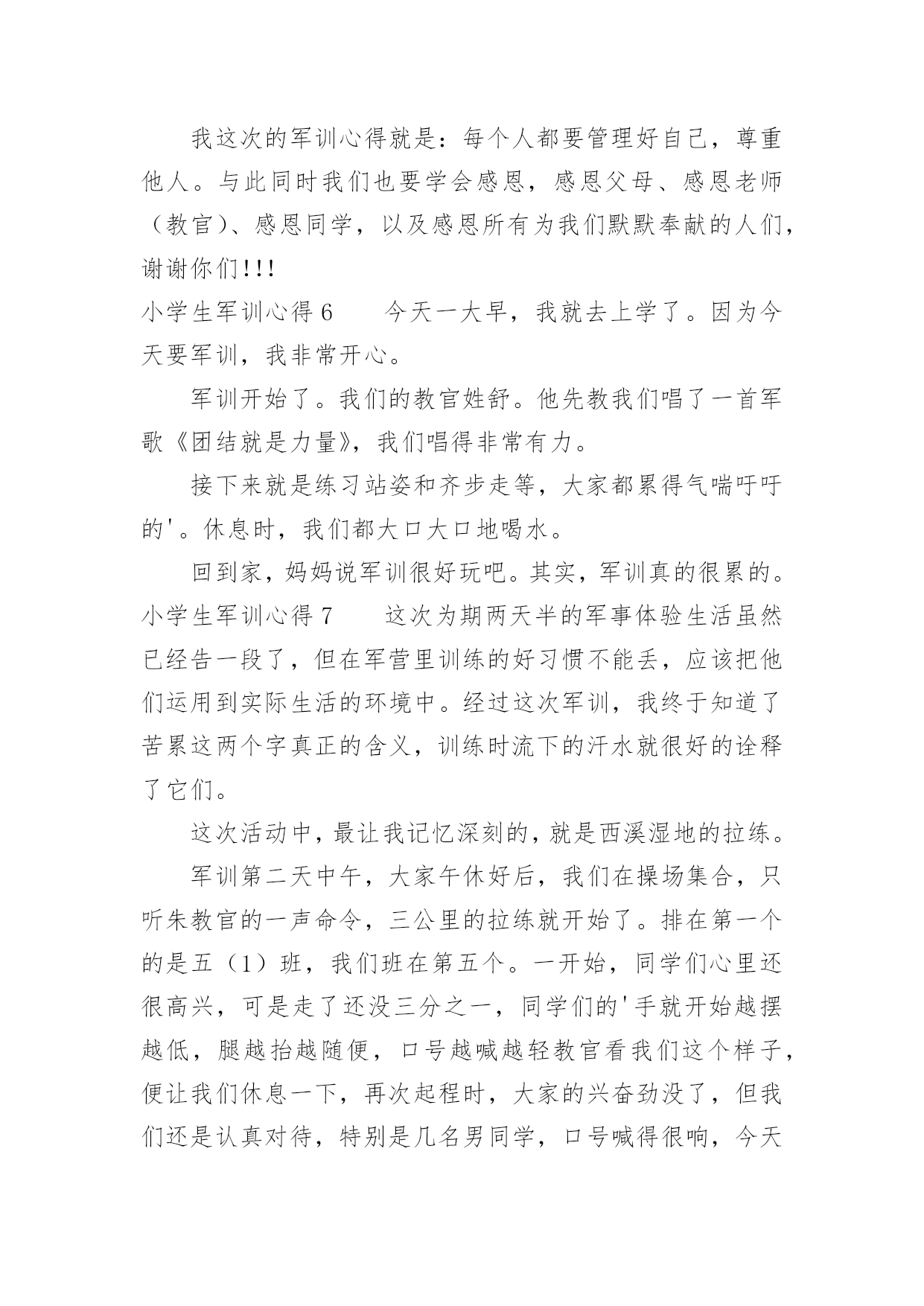 小学生军训心得小学生军训心得当我们备受启迪时,就很有必要写一篇心得体会,如此可以一直更新迭代自己的想法。应该怎么写才合适呢?以下是小编收集整理的小学生军训心得,仅供参考,希望能够帮助到大家。小学生军训心得1军训让我的感触很深,我深深体会到了作为一名军人有多么的辛苦和不容易。军训不仅磨练了我的意志还让我锻炼了我的耐力、素质!虽然很苦、很累但是我很高兴,因为军训使我认识了许多新同学,不管什么事情都得付出才会有回报,人生是苦乐交织的。在这几天的军训生活中,我们腰也酸、腿也疼,实在有些吃不消了,但是为了胜利完成军