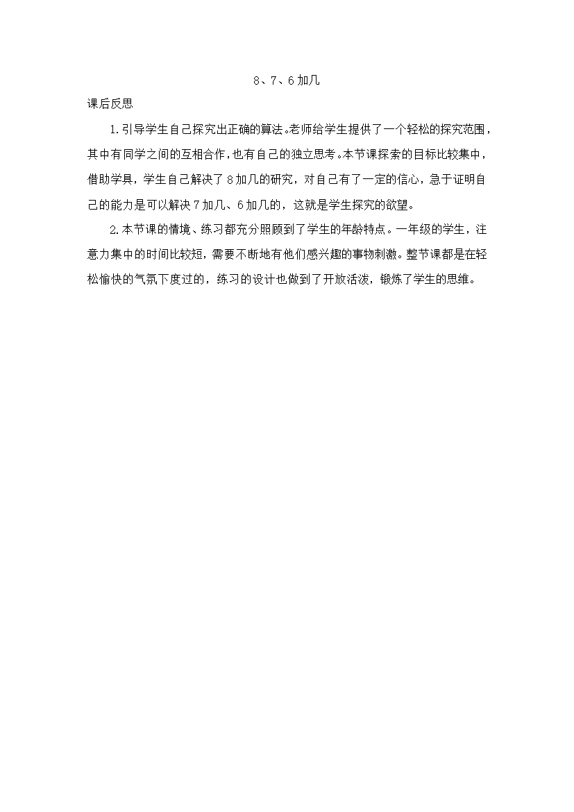 8、7、6加几课后反思1.引导学生自己探究出正确的算法。老师给学生提供了一个轻松的探究范围其中有同学之间的互相合作也有自己的独立思考。本节课探索的目标比较集中借助学具学生自己解决了8加几的研究对自己有了一定的信心急于证明自己的能力是可以解决7加几、6加几的这就是学生探究的欲望。2.本节课的情境、练习都充分照顾到了学生的年龄特点。一年级的学生注意力集中的时间比较短需要不断地有他们感兴趣的事物刺激。整节课都是在轻松愉快的气氛下度过的练习的设计也做到了开放活泼锻炼了学生的思维。