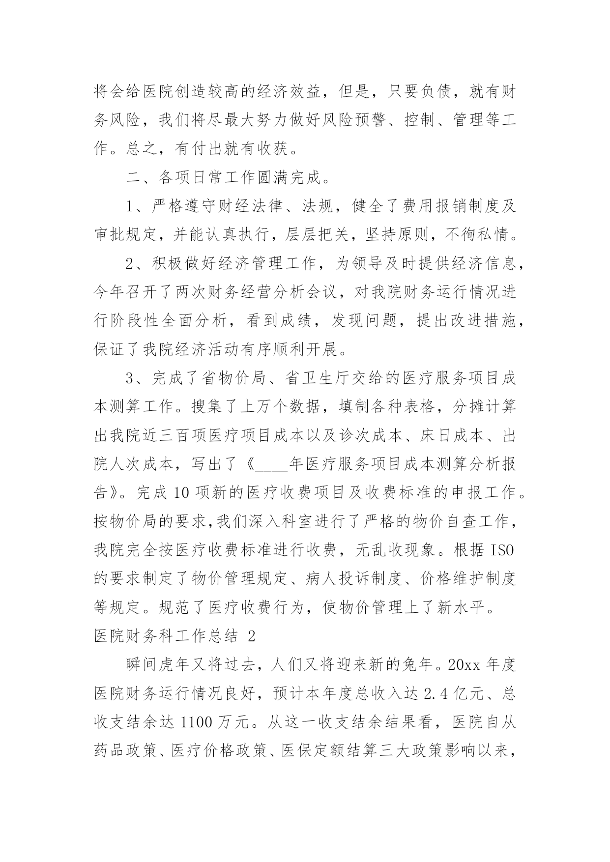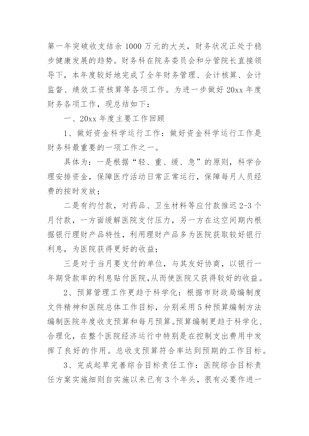 医院财务科工作总结医院财务科工作总结充实的工作生活一不留神就过去了,这段时间以来的工作,收获了不少成绩,是时候认真地做好工作总结了。那么如何把工作总结写出新花样呢?以下是小编帮大家整理的医院财务科工作总结,希望能够帮助到大家。瞬间XX年又将过去,人们又将迎来新的XX年。XX年度医院财务运行情况良好,预计本年度总收入达2.4亿元、总收支结余达1100万元。从这一收支结余结果看,医院自从药品政策、医疗价格政策、医保定额结算三大政策影响以来,第一年突破收支结余1000万元的大关,财务状况正处于稳步健康发展的趋势