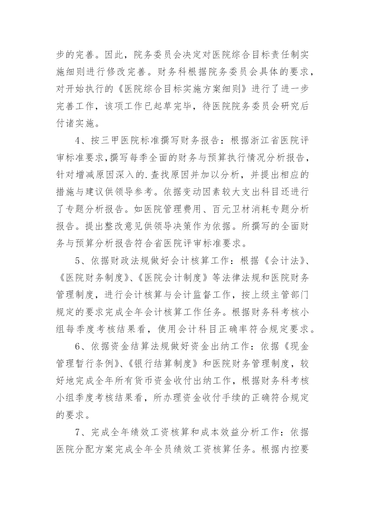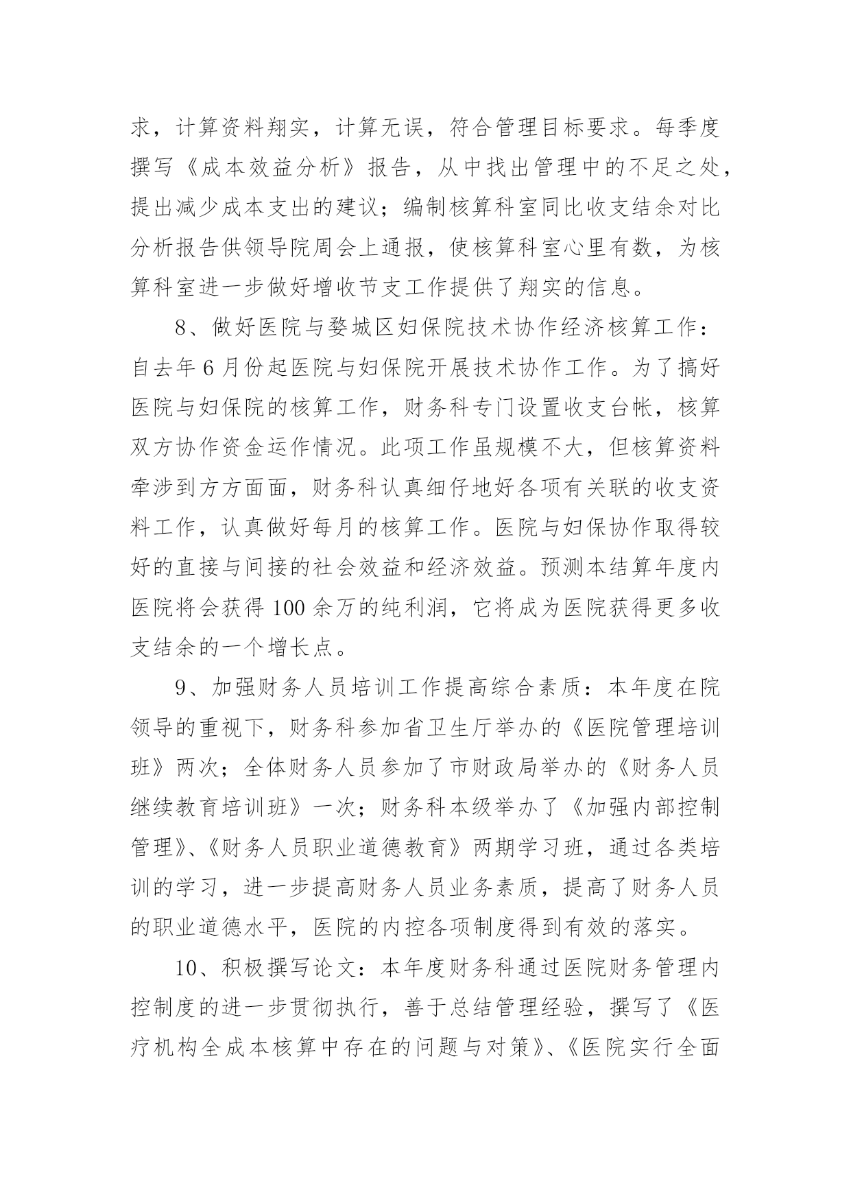 医院财务科工作总结医院财务科工作总结总结是对取得的成绩、存在的问题及得到的经验和教训等方面情况进行评价与描述的一种书面材料,它可以有效锻炼我们的语言组织能力,快快来写一份总结吧。那么总结要注意有什么内容呢?以下是小编为大家整理的医院财务科工作总结,欢迎阅读与收藏。医院财务科工作总结1财务处20xx年工作总结财务处在过去一年中认真履行监督管理职能,积极参与医院管理,全处人员同心协力,按照医院整体部署和财务处年初既定工作计划,通过紧张细致的工作,圆满完成了20xx年度工作计划,在财务核算、经济管理和物价管理,