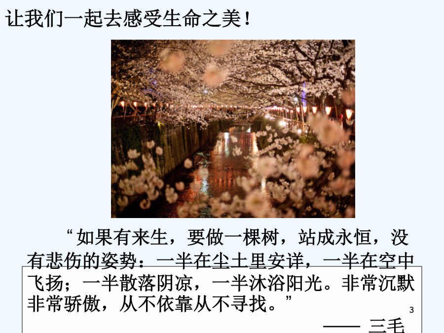 “尊重生命,珍爱自我”为什么说生命是可贵的?“如果有来生,要做一棵树,站成永恒,没有悲伤的姿势:一半在尘土里安详,一半在空中飞扬;一半散落阴凉,一半沐浴阳光。非常沉默非常骄傲,从不依靠从不寻找。”——三毛45戴胜鸟78大家学习辛苦了,还是要坚持1112生命的奇迹尼克·胡哲16尼克·胡哲(NickVujicic),1982年12月4日出生于澳大利亚墨尔本,澳大利亚演讲家。他天生没有四肢,只在左侧臀部以下的位置有一个带着两个脚指头的小“脚”。尽管身体残疾,但父母并没有放弃对他的教育。胡哲的父亲是一名工程师、母