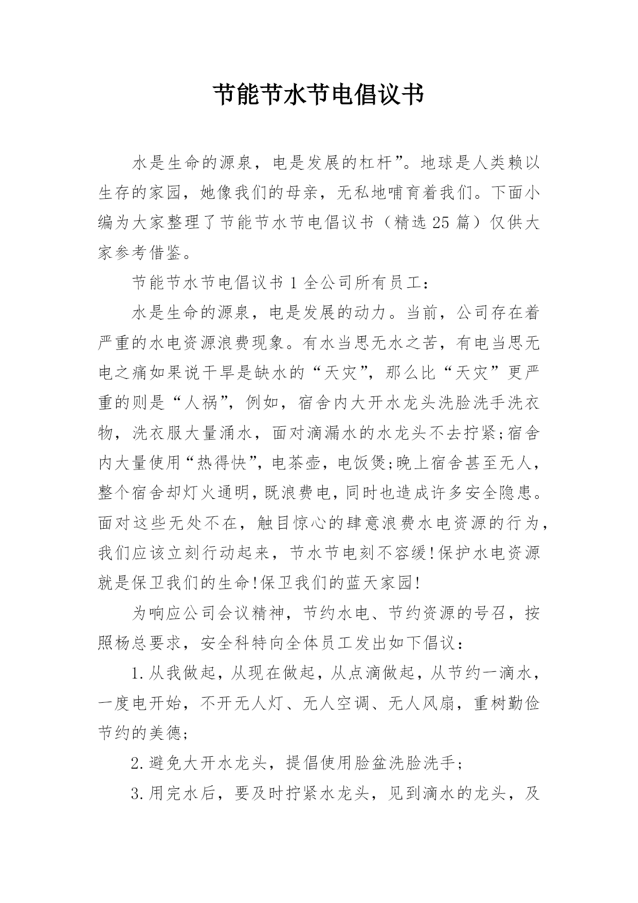 节能节水节电倡议书水是生命的源泉,电是发展的杠杆”。地球是人类赖以生存的家园,她像我们的母亲,无私地哺育着我们。下面小编为大家整理了节能节水节电倡议书(精选25篇)仅供大家参考借鉴。节能节水节电倡议书1全公司所有员工:水是生命的源泉,电是发展的动力。当前,公司存在着严重的水电资源浪费现象。有水当思无水之苦,有电当思无电之痛如果说干旱是缺水的“天灾”,那么比“天灾”更严重的则是“人祸”,例如,宿舍内大开水龙头洗脸洗手洗衣物,洗衣服大量涌水,面对滴漏水的水龙头不去拧紧;宿舍内大量使用“热得快”,电茶壶,电饭煲