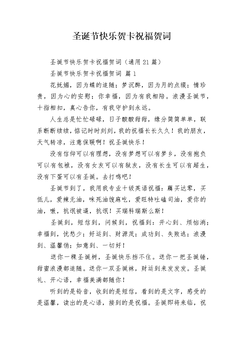 圣诞节快乐贺卡祝福贺词圣诞节快乐贺卡祝福贺词(通用21篇)圣诞节快乐贺卡祝福贺词篇1花妩媚,因为蝶的追随;梦沉醉,因为月的点缀;情珍贵,因为心的安慰;你幸福,因为有我相陪。浪漫圣诞节,十指相扣,真心告你,有我守护到永远。人生总是忙忙碌碌,日子酸酸甜甜,缘分简简单单,联系断断续续,惦记时时刻刻,我的祝福长长久久!我的朋友,天气转凉,注意保暖啊!祝圣诞快乐!没有信仰可以有理想,没有梦想可以有梦乡,没有抱负可以有包袱,没有女友可以有狱友,没有长生可以有超生,没有下蛋可以有圣诞。去打鸣吧!圣诞节到了,我用我专业十