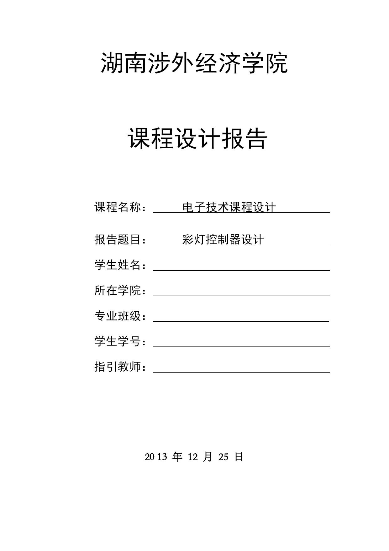 湖南涉外经济学院课程设计报告课程名称:电子技术课程设计报告题目:彩灯控制器的设计学生姓名:所在学院:专业班级:学生学号:指导教师:2013年12月25日彩灯控制器的设计报告题目彩灯控制器的设计完成时间2013/12/25学生姓名专业班级指导教师职称讲师总体设计要求和技术要点一、设计要求1、用16个三色LED灯组成一个彩灯模型;2、循环显示不少于16种不同显示状态,具有一定的观赏性;3、每种状态的显示时间在1S-2S可调;4、具有加电复位功能二、技术要点系统框图如下:摘要现代电子技术的课程设计主要利用EWB