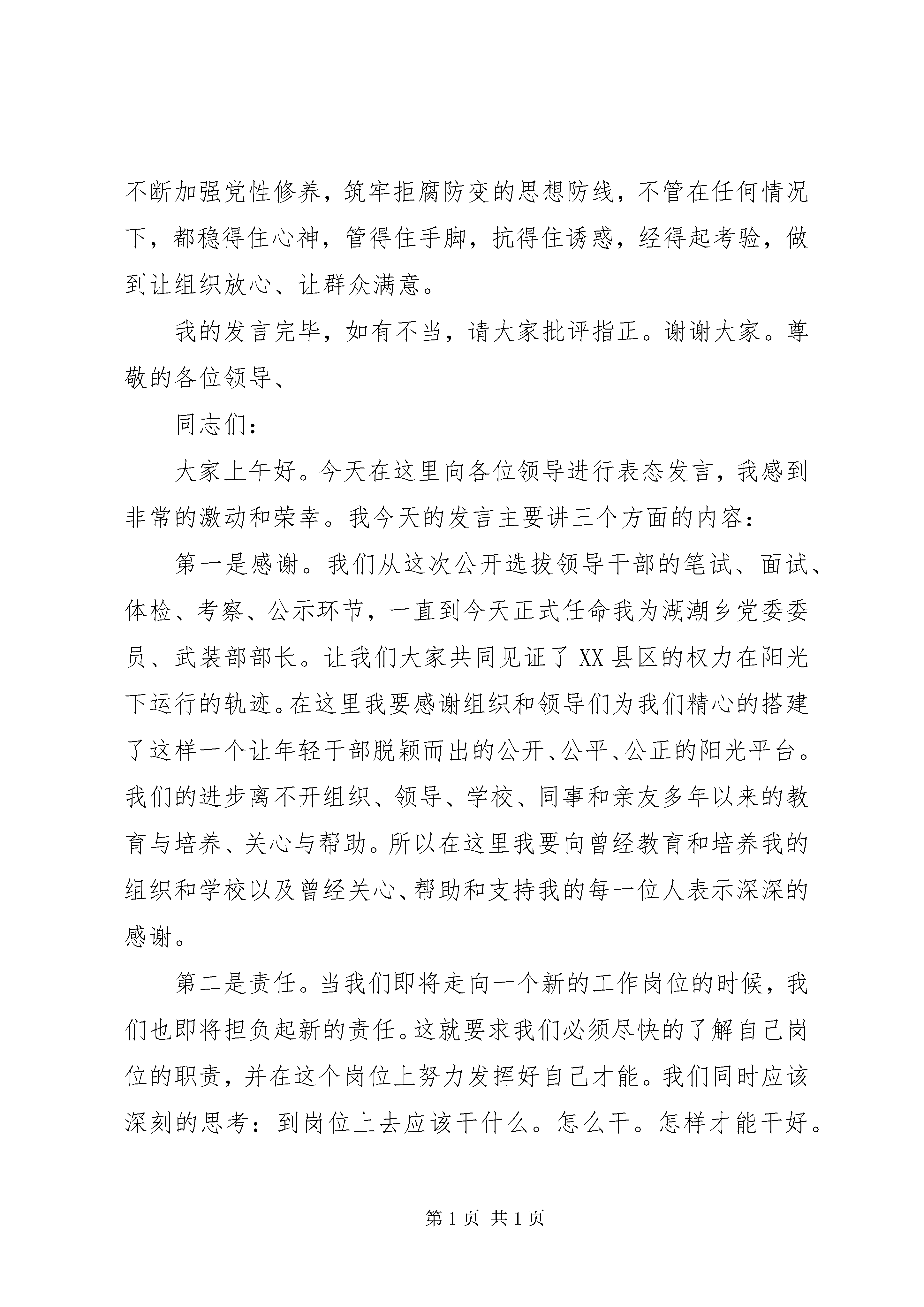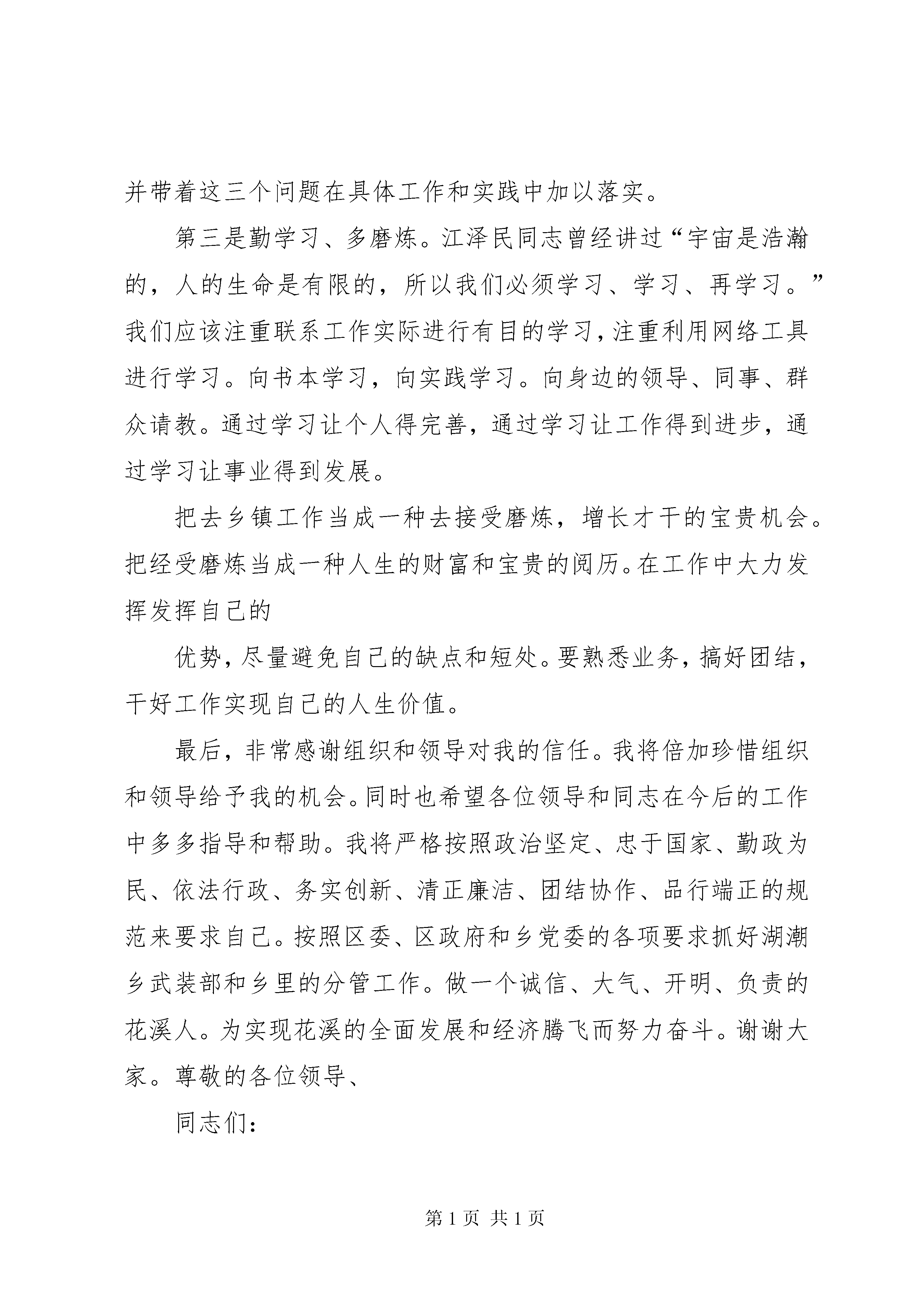 第PAGE\*Arabic\*MERGEFORMAT11页共NUMPAGES\*MERGEFORMAT11页全国基层综治办主任培训发言典型材料综治办主任任职表态发言尊敬的各位领导、同志们:首先我衷心感谢乡党委、政府的信任,感谢各位领导的关心,感谢同志们对我的支持。在此次全县中层干部竞争上岗活动中我被选为乡综治办主任一职。这次任职不仅是对我的一种认同与接受,更是对我的一份希望和重托。让我有更多的机会,为槐坎服务。在今后的工作中,我将苦学为先,实干为本,团结为上,廉洁为要,努力适应新形势,把握新要