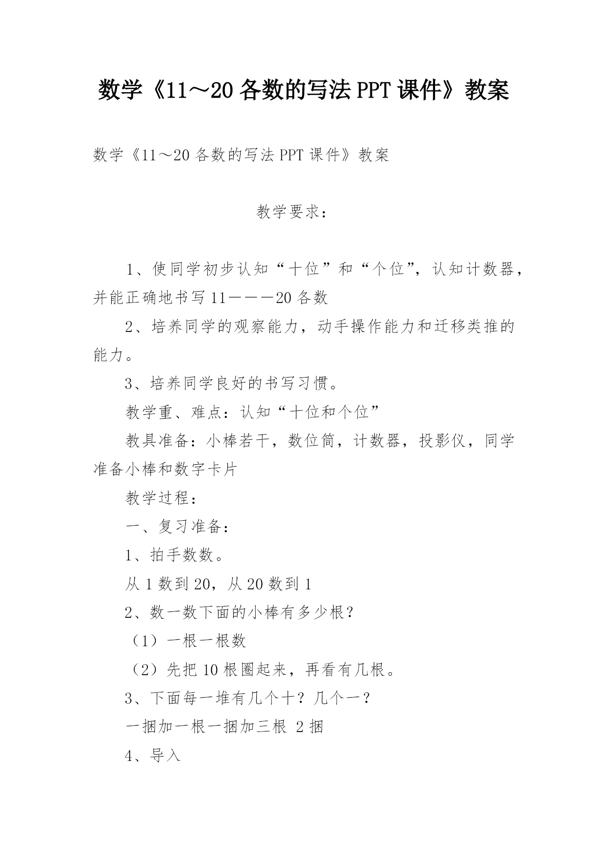 数学《11~20各数的写法PPT课件》教案数学《11~20各数的写法PPT课件》教案教学要求:1、使同学初步认知“十位”和“个位”,认知计数器,并能正确地书写11―――20各数2、培养同学的观察能力,动手操作能力和迁移类推的能力。3、培养同学良好的书写习惯。教学重、难点:认知“十位和个位”教具准备:小棒若干,数位筒,计数器,投影仪,同学准备小棒和数字卡片教学过程:一、复习准备:1、拍手数数。从1数到20,从20数到12、数一数下面的小棒有多少根?(1)一根一根数(2)先把10根圈起来,再看有几根。3、下面
