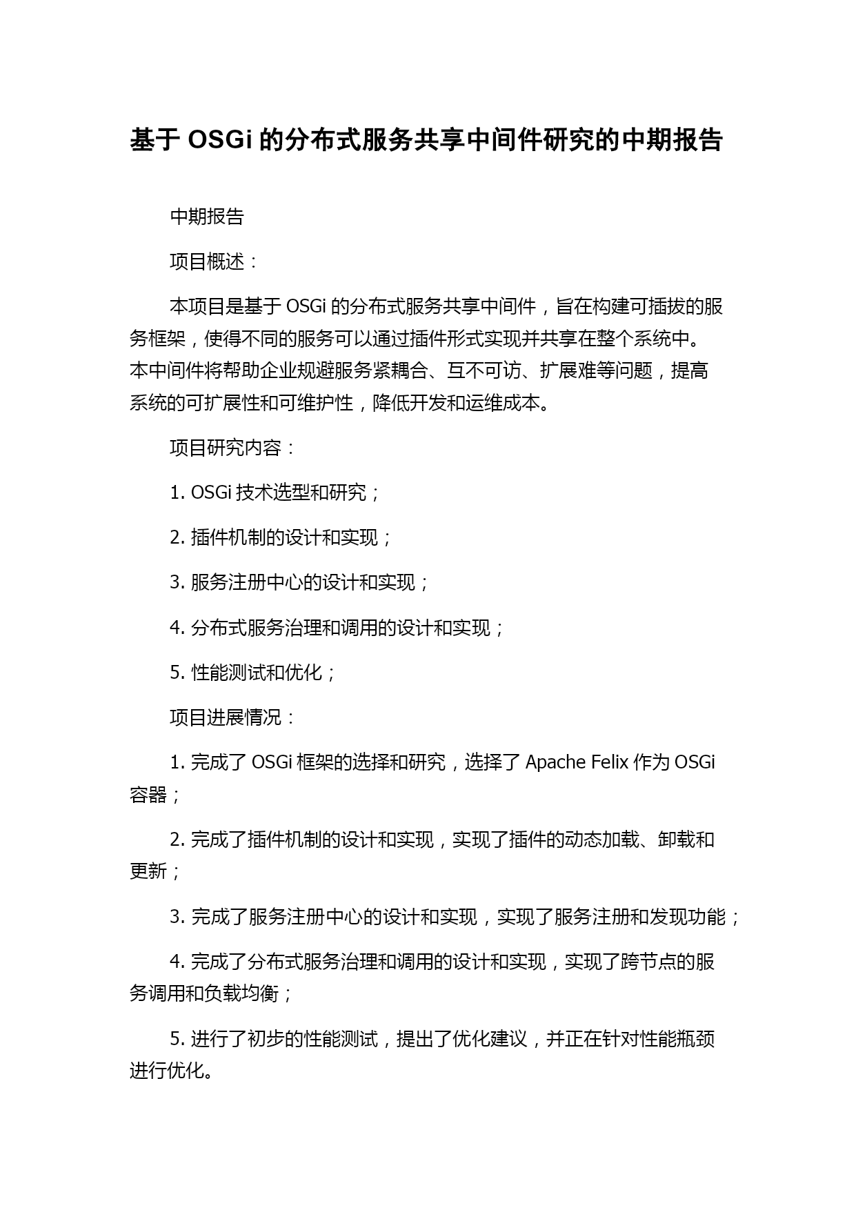 基于OSGi的分布式服务共享中间件研究的中期报告中期报告项目概述:本项目是基于OSGi的分布式服务共享中间件,旨在构建可插拔的服务框架,使得不同的服务可以通过插件形式实现并共享在整个系统中。本中间件将帮助企业规避服务紧耦合、互不可访、扩展难等问题,提高系统的可扩展性和可维护性,降低开发和运维成本。项目研究内容:1.OSGi技术选型和研究;2.插件机制的设计和实现;3.服务注册中心的设计和实现;4.分布式服务治理和调用的设计和实现;5.性能测试和优化;项目进展情况:1.完成了OSGi框架的选择和研究,选择了