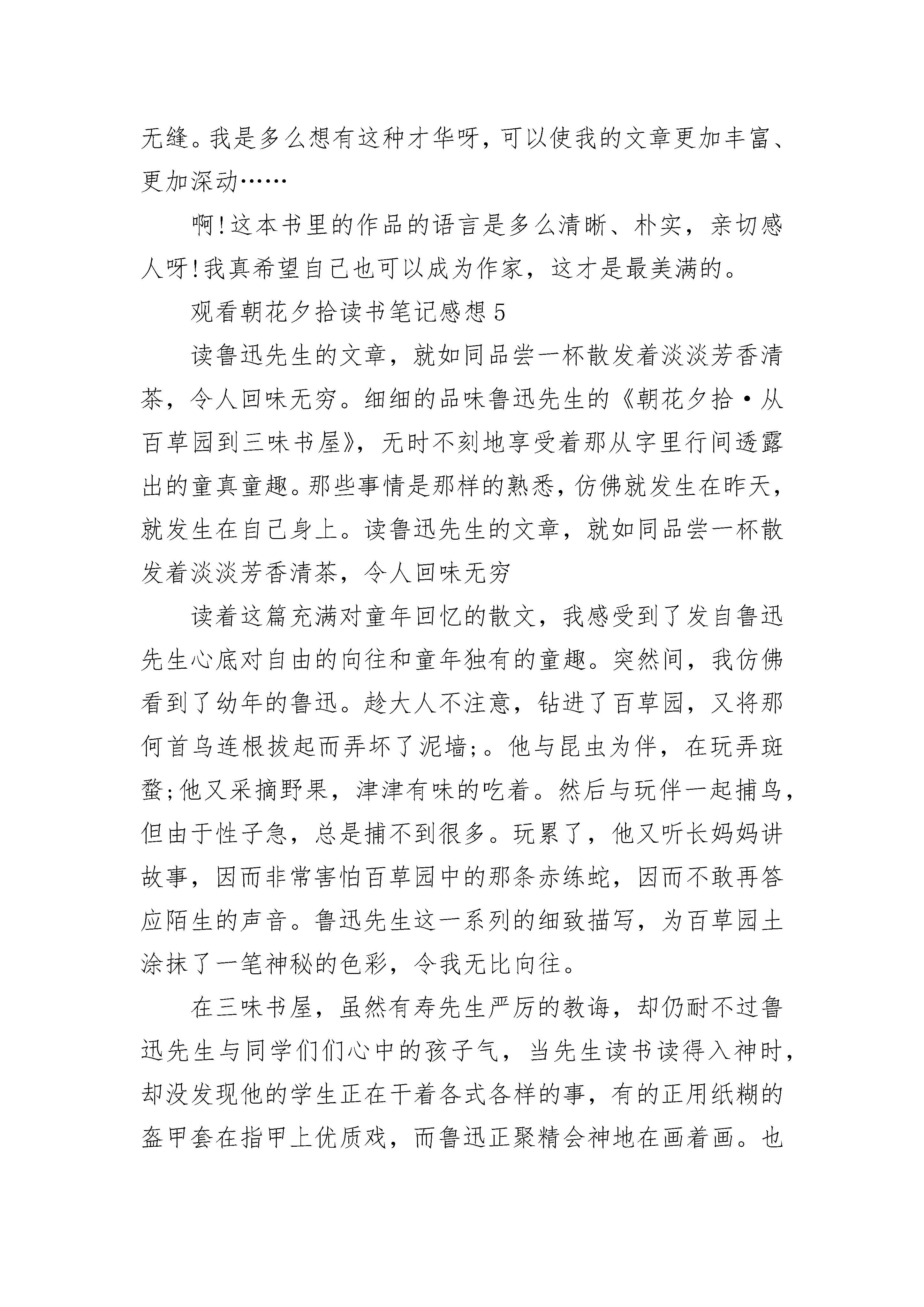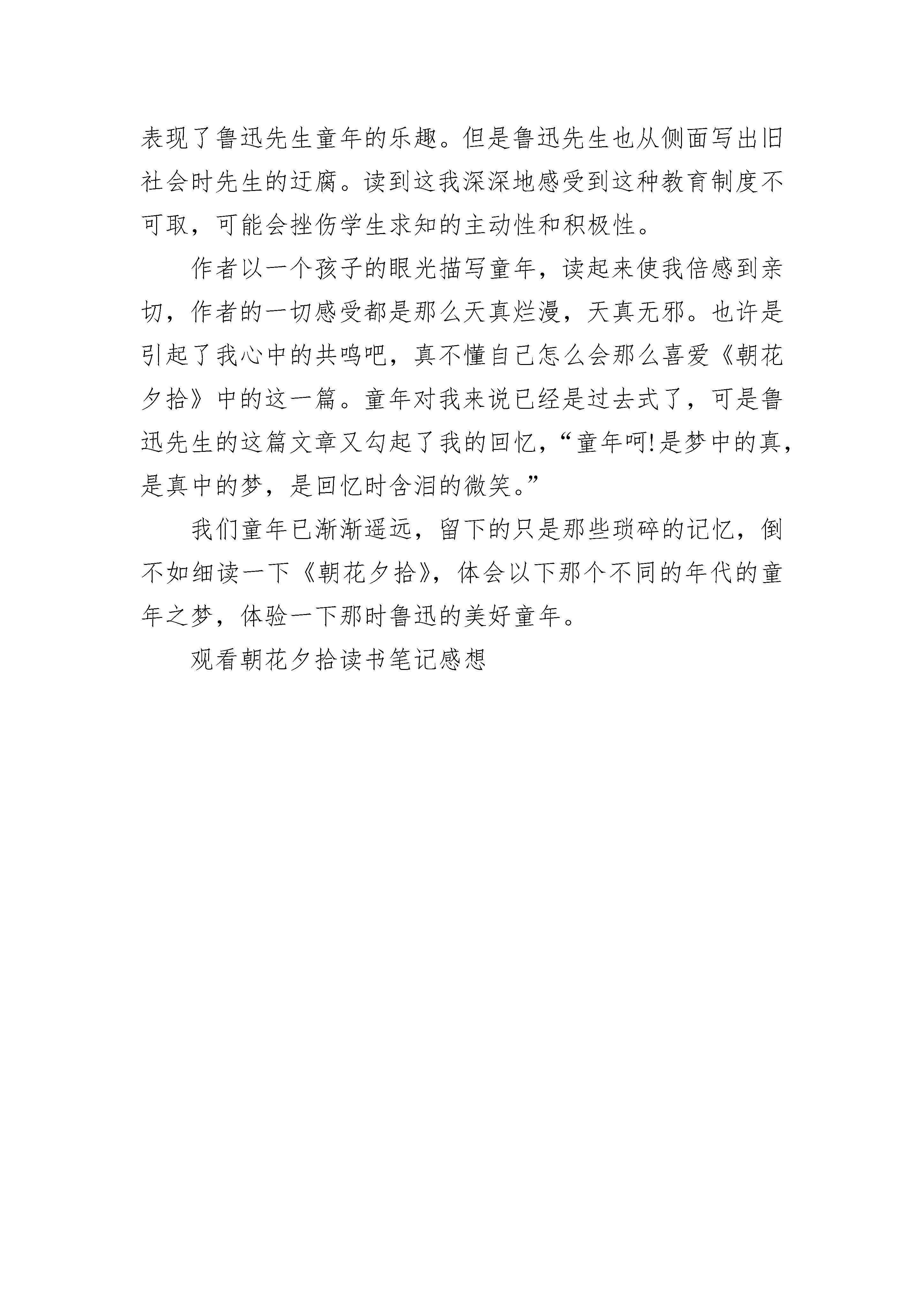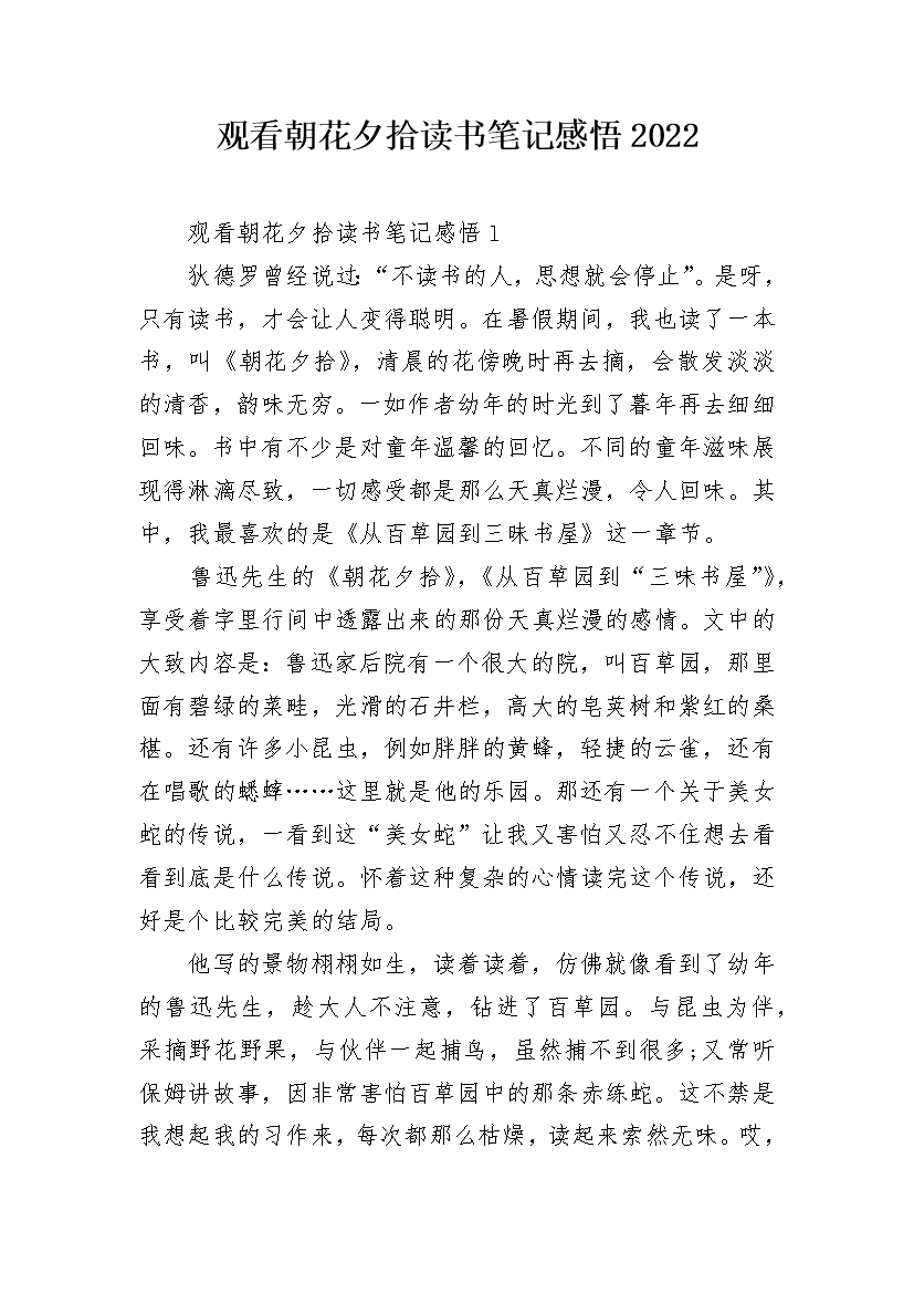 观看朝花夕拾读书笔记感悟2022观看朝花夕拾读书笔记感悟1狄德罗曾经说过:“不读书的人,思想就会停止”。是呀,只有读书,才会让人变得聪明。在暑假期间,我也读了一本书,叫《朝花夕拾》,清晨的花傍晚时再去摘,会散发淡淡的清香,韵味无穷。一如作者幼年的时光到了暮年再去细细回味。书中有不少是对童年温馨的回忆。不同的童年滋味展现得淋漓尽致,一切感受都是那么天真烂漫,令人回味。其中,我最喜欢的是《从百草园到三昧书屋》这一章节。鲁迅先生的《朝花夕拾》,《从百草园到“三味书屋”》,享受着字里行间中透露出来的那份天真烂
