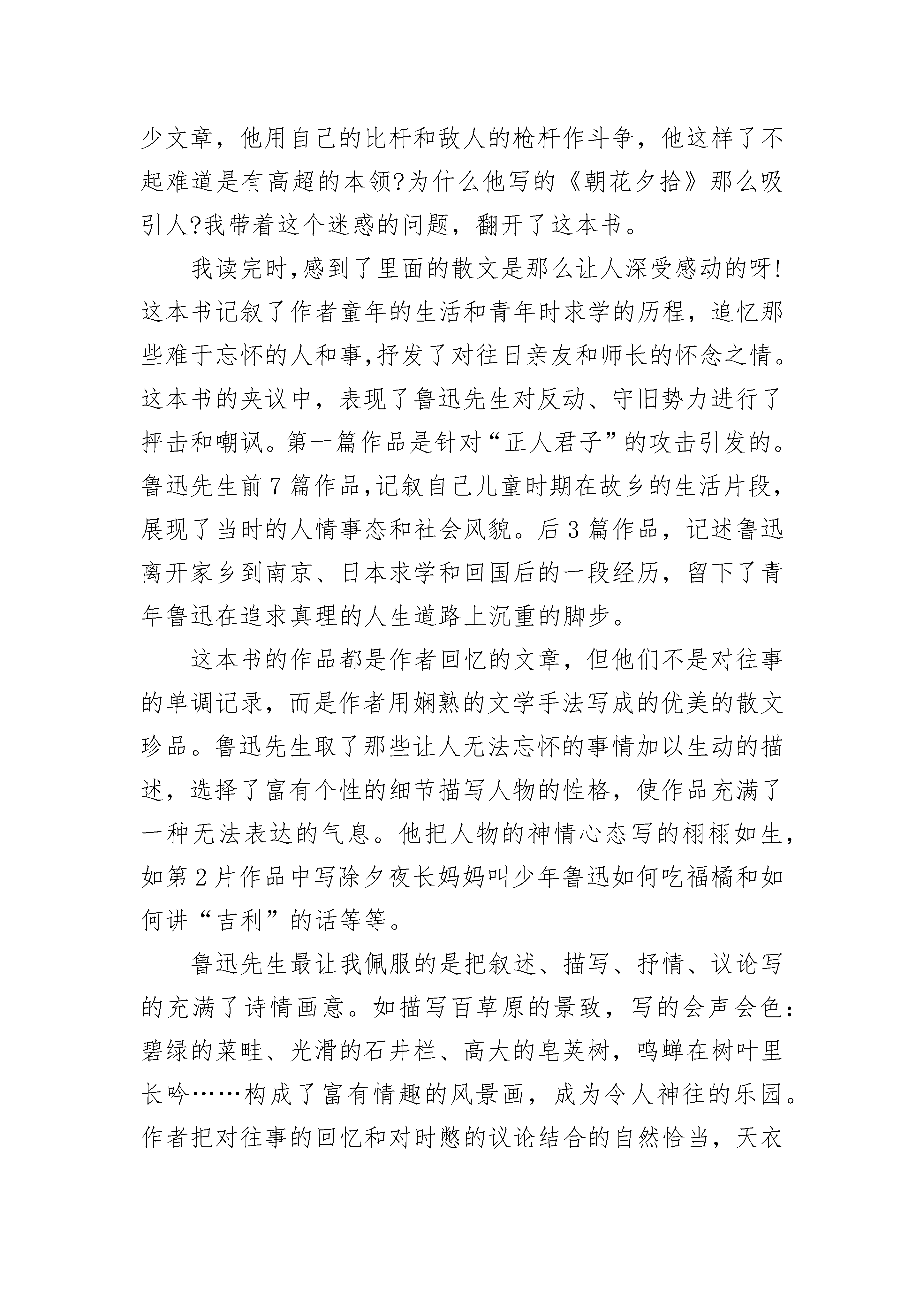 观看朝花夕拾读书笔记心得2022范文手捧鲁迅先生的《朝花夕拾》,品味着从字里行间透露出年少轻狂时的童真,神思似乎也飘向了那份曾经属于我们的逍遥日子。《朝花夕拾》,正同于它另类的名字一样,这本脍炙人口的巨作,是鲁迅先生在风烛残年的岁月里写下的。老了,累了,回味起童年时的点点滴滴,心中还是会有当初的味道,想必还别有一番滋味吧。清晨绽放的鲜花有了晨曦会显得更加娇嫩,到了夕阳西下时分去摘取,失去了刚刚盛开时的娇艳与芳菲,晚霞的照射却使它平添了一中风韵,那若有若无的清香在风的导送下,让人浮想联翩。像是在尝一道佳肴,