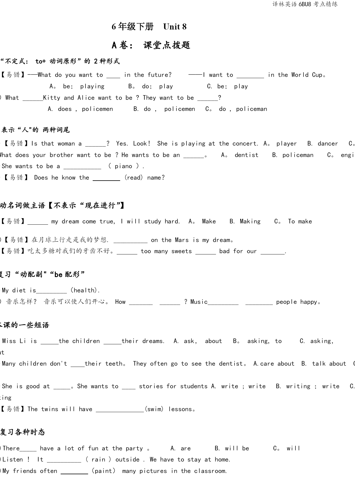 译林英语6BU8考点精练译林英语6BU8考点精练译林英语6BU8考点精练6年级下册Unit8A卷:课堂点拨题1.“不定式:to+动词原形”的2种形式(1)【易错】-—Whatdoyouwanttointhefuture?——IwanttointheWorldCup。A。be;playingB。do;playC.be;play(2)What______KittyandAlicewanttobe?Theywanttobe______?A.does,policemenB.do,policemenC。do,pol