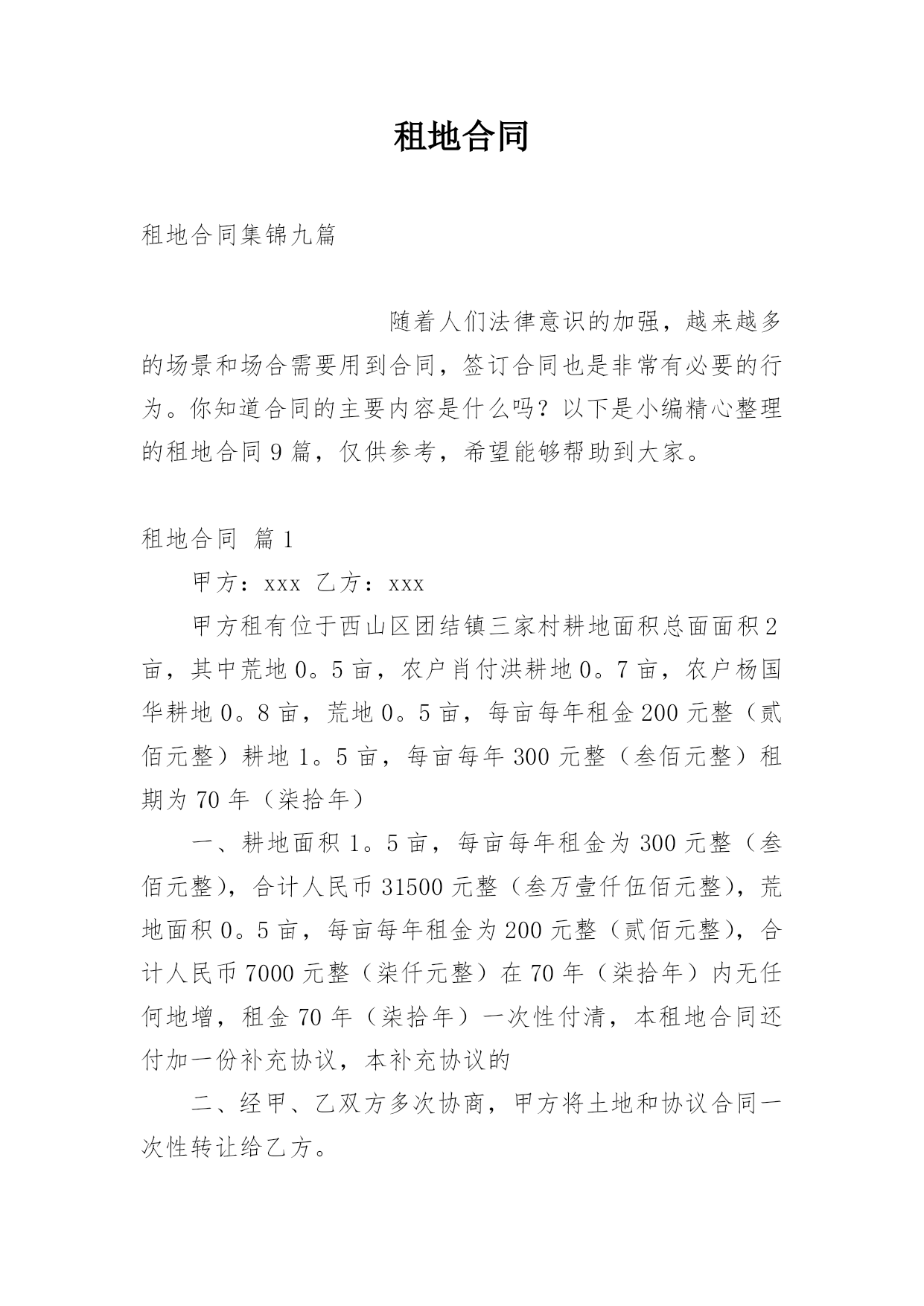 租地合同租地合同集锦九篇随着人们法律意识的加强,越来越多的场景和场合需要用到合同,签订合同也是非常有必要的行为。你知道合同的主要内容是什么吗?以下是小编精心整理的租地合同9篇,仅供参考,希望能够帮助到大家。租地合同篇1甲方:xxx乙方:xxx甲方租有位于西山区团结镇三家村耕地面积总面面积2亩,其中荒地0。5亩,农户肖付洪耕地0。7亩,农户杨国华耕地0。8亩,荒地0。5亩,每亩每年租金200元整(贰佰元整)耕地1。5亩,每亩每年300元整(叁佰元整)租期为70年(柒拾年)一、耕地面积1。5亩,每亩每年租金为