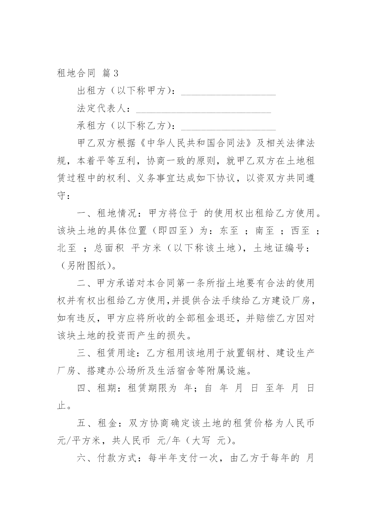租地合同关于租地合同模板汇总10篇在人们的法律意识不断增强的社会,关于合同的利益纠纷越来越多,签订合同也是非常有必要的行为。你所见过的合同是什么样的呢?下面是小编为大家整理的租地合同10篇,仅供参考,希望能够帮助到大家。租地合同篇1甲方:乙方:根据《中华人民共和国农村土地承包法》、《农村土地承包经营权流转管理办法》、《中华人民共和国合同法》等法律、法规和国家有关政策的规定,甲乙双方本着平等、自愿、有偿的原则,经双方协商一致,就土地合作经营权入股事宜,订立本合同。一、入股土地基本情况、用途、入股期限及股份分