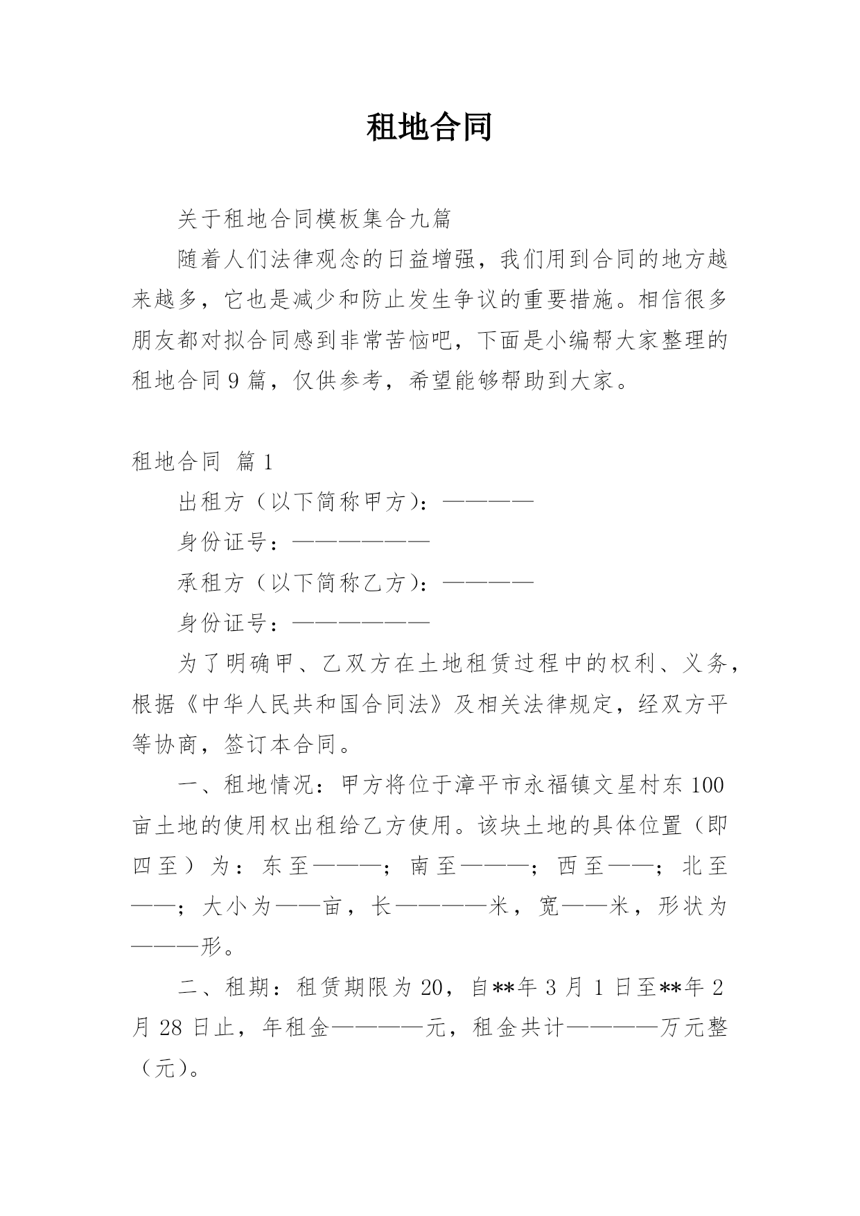 租地合同关于租地合同模板集合九篇随着人们法律观念的日益增强,我们用到合同的地方越来越多,它也是减少和防止发生争议的重要措施。相信很多朋友都对拟合同感到非常苦恼吧,下面是小编帮大家整理的租地合同9篇,仅供参考,希望能够帮助到大家。租地合同篇1出租方(以下简称甲方):————身份证号:——————承租方(以下简称乙方):————身份证号:——————为了明确甲、乙双方在土地租赁过程中的权利、义务,根据《中华人民共和国合同法》及相关法律规定,经双方平等协商,签订本合同。一、租地情况:甲方将位于漳平市永福镇文星村